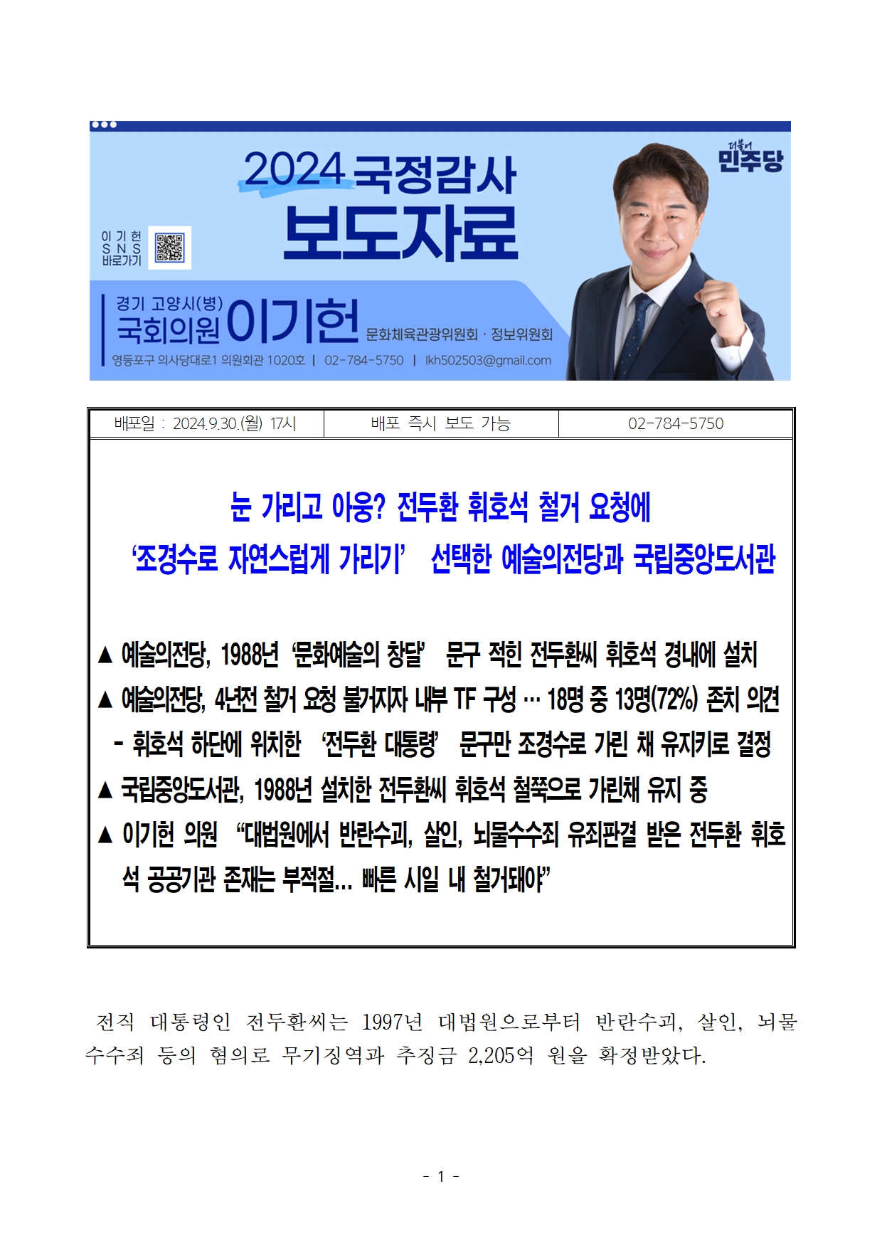 [이기헌 의원(고양시 병) 보도자료] 눈 가리고 아웅? 전두환 휘호석 철거 요청에 ‘조경수로 자연스럽게 가리기’ 선택한 예술의전당과 국립중앙도서관