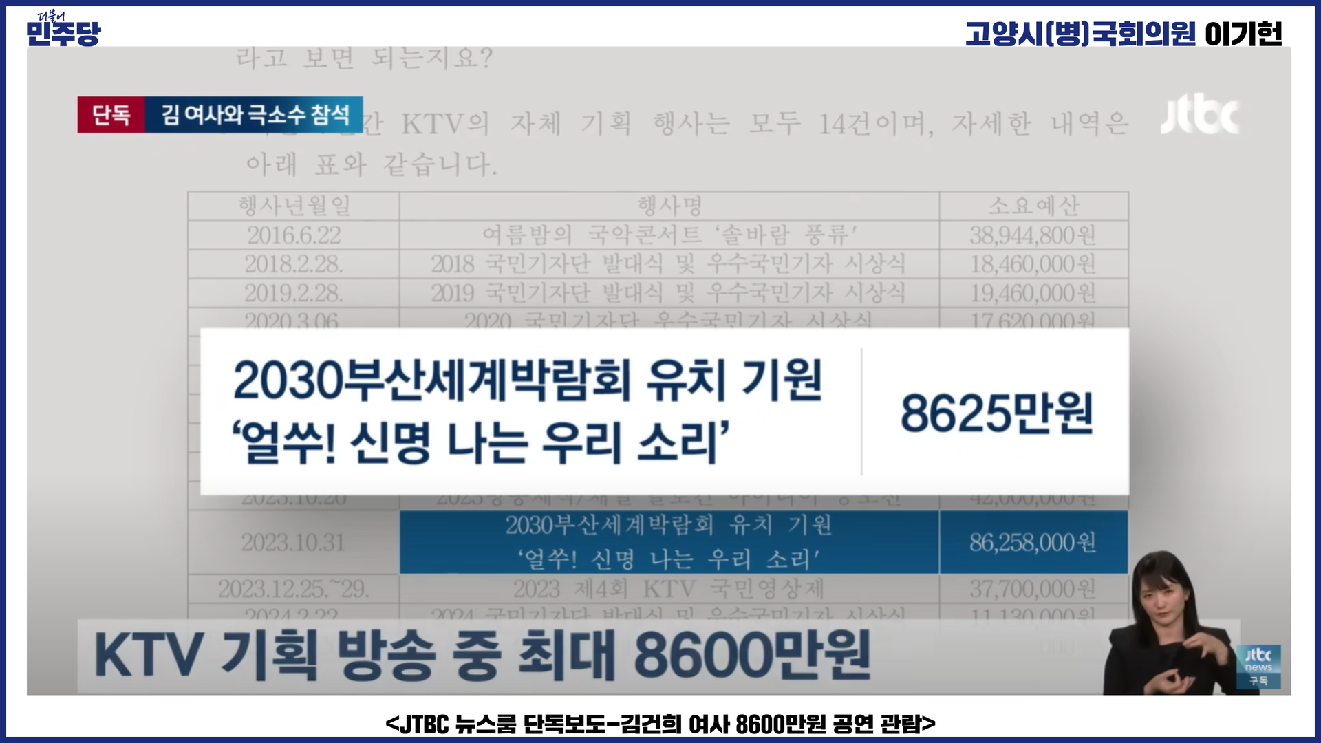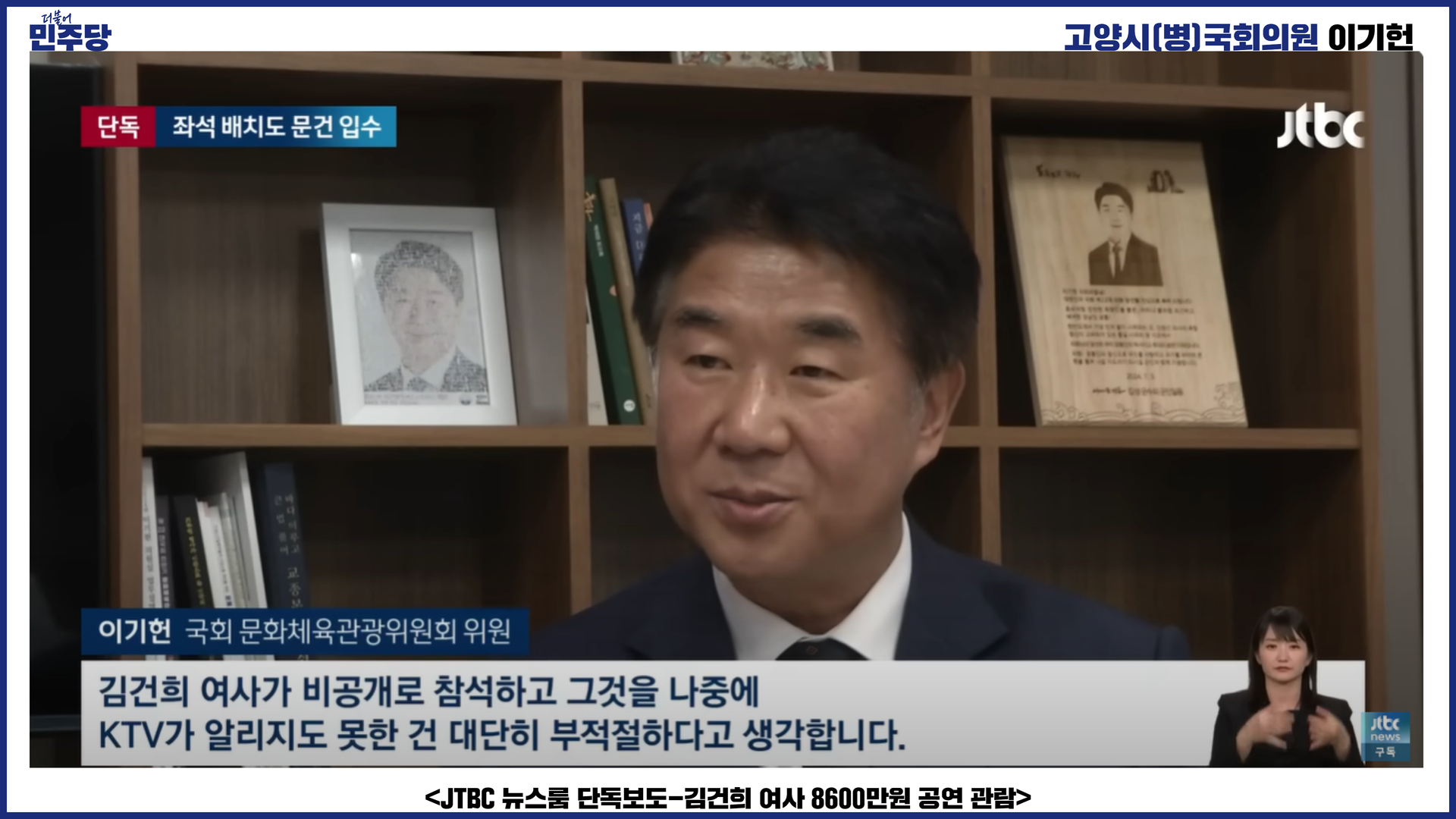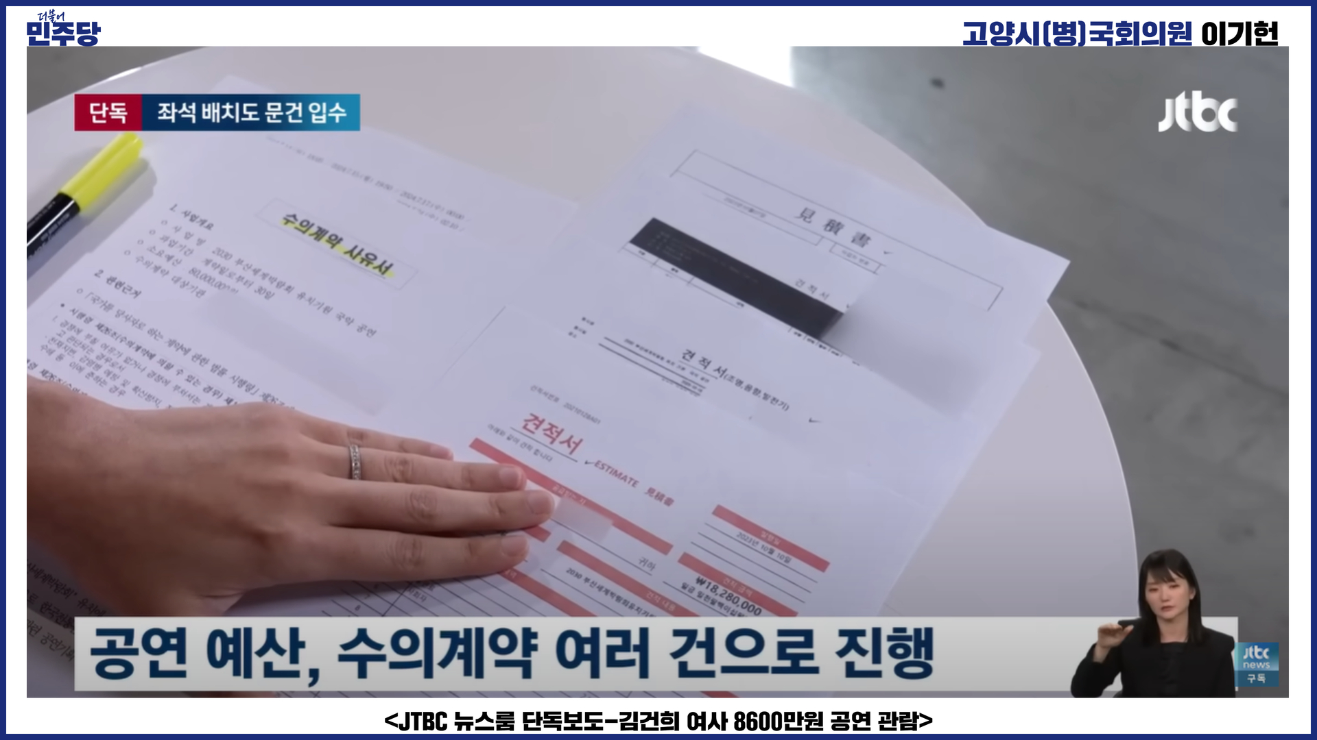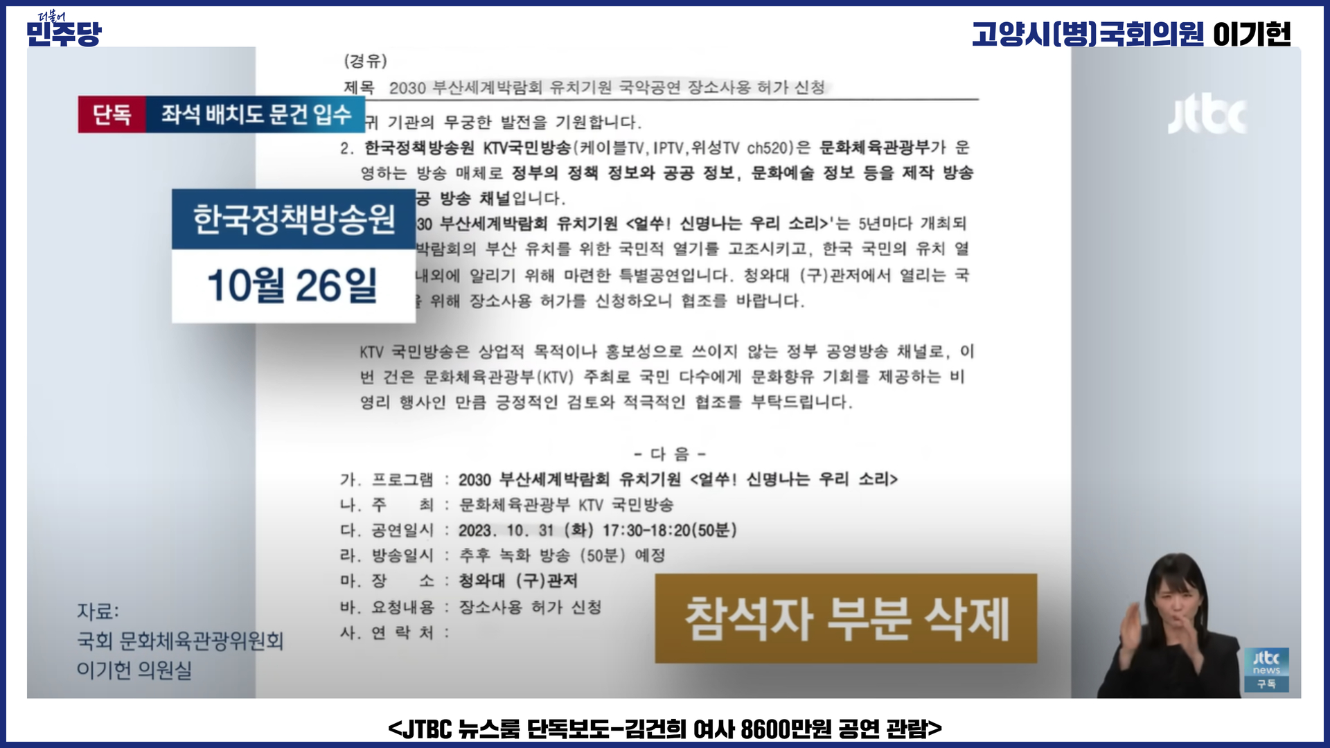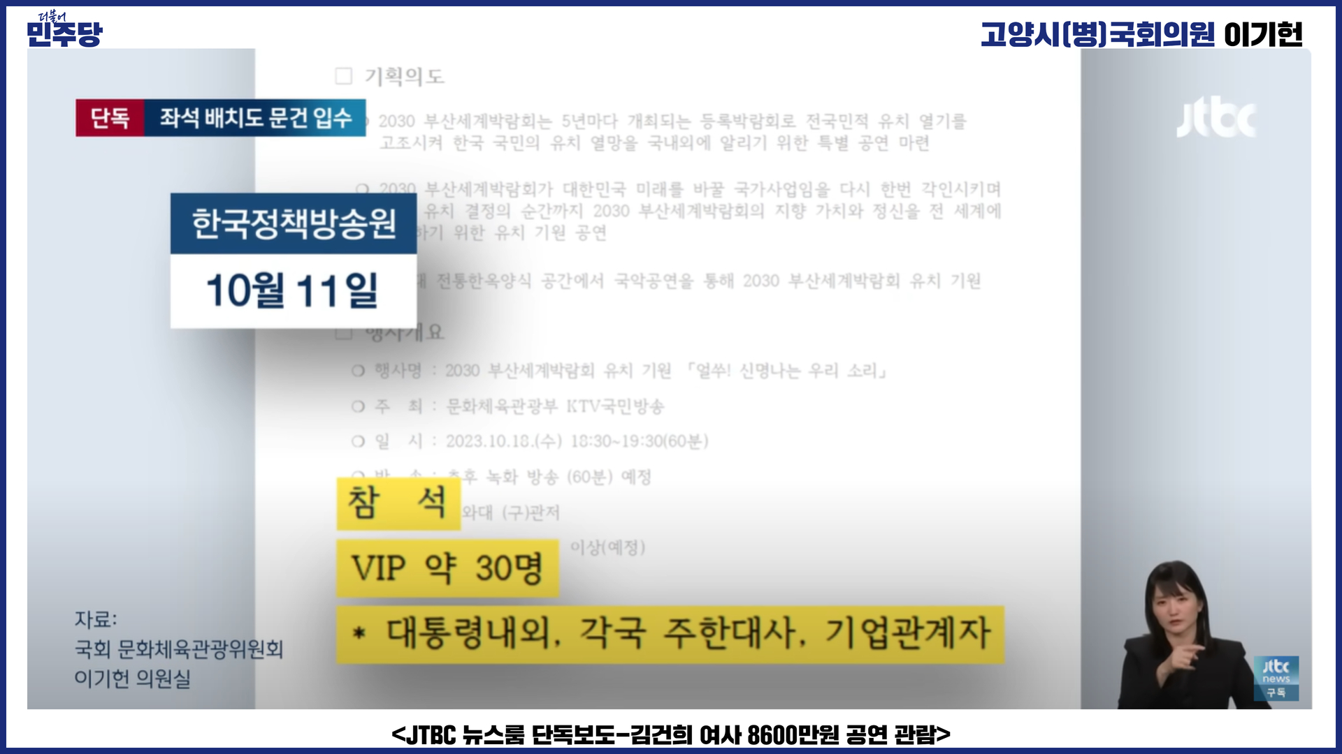 [이기헌 의원(고양시 병) 언론보도]<JTBC 뉴스룸>[단독]무관중이라던 8600만원 공연 녹화…꽃장식 관객석에 '김 여사' 있었다