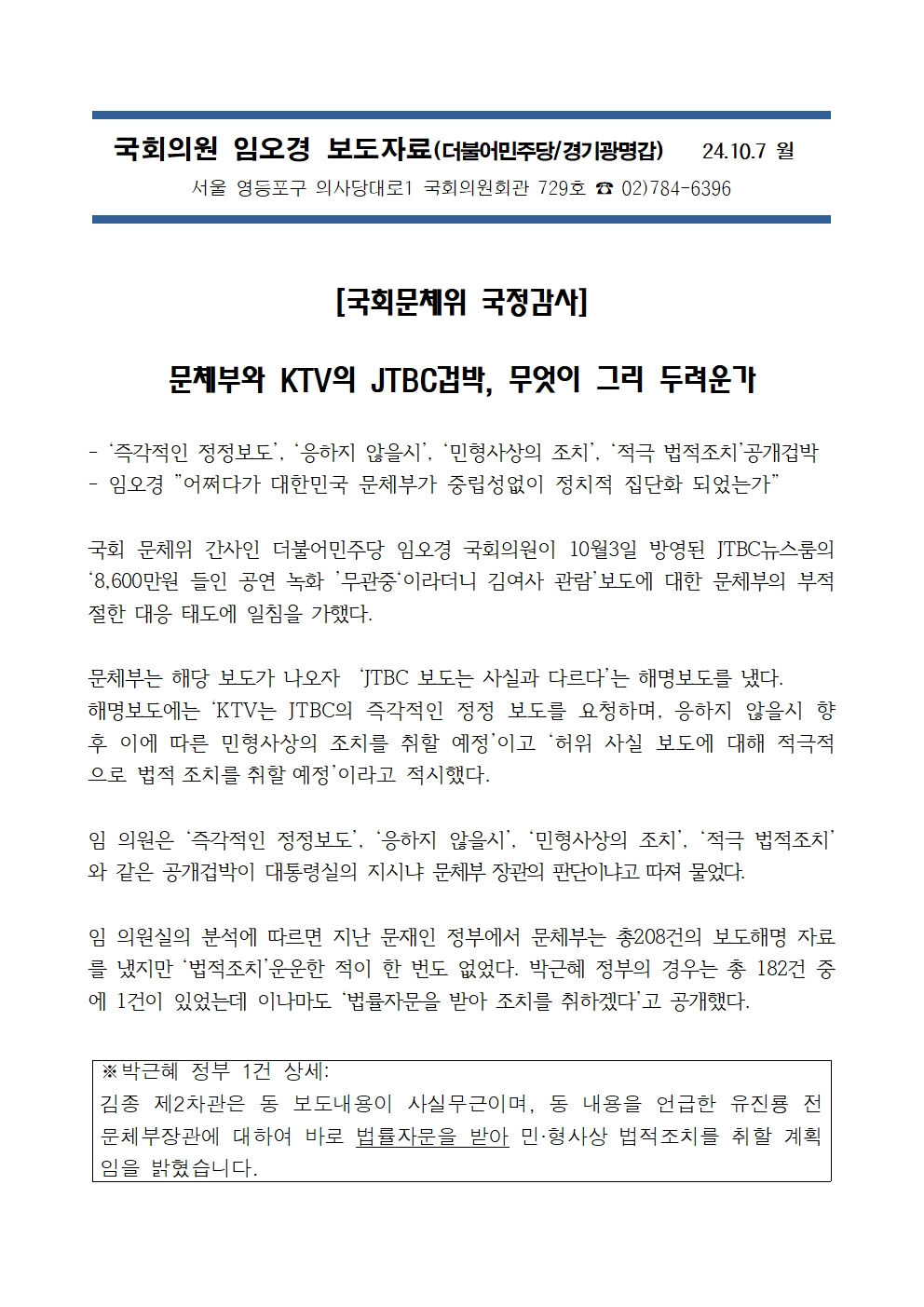 24.10.07_임오경 국회의원 보도_문체부와 KTV의 JTBC겁박 무엇이 그리 두려운가.hwp