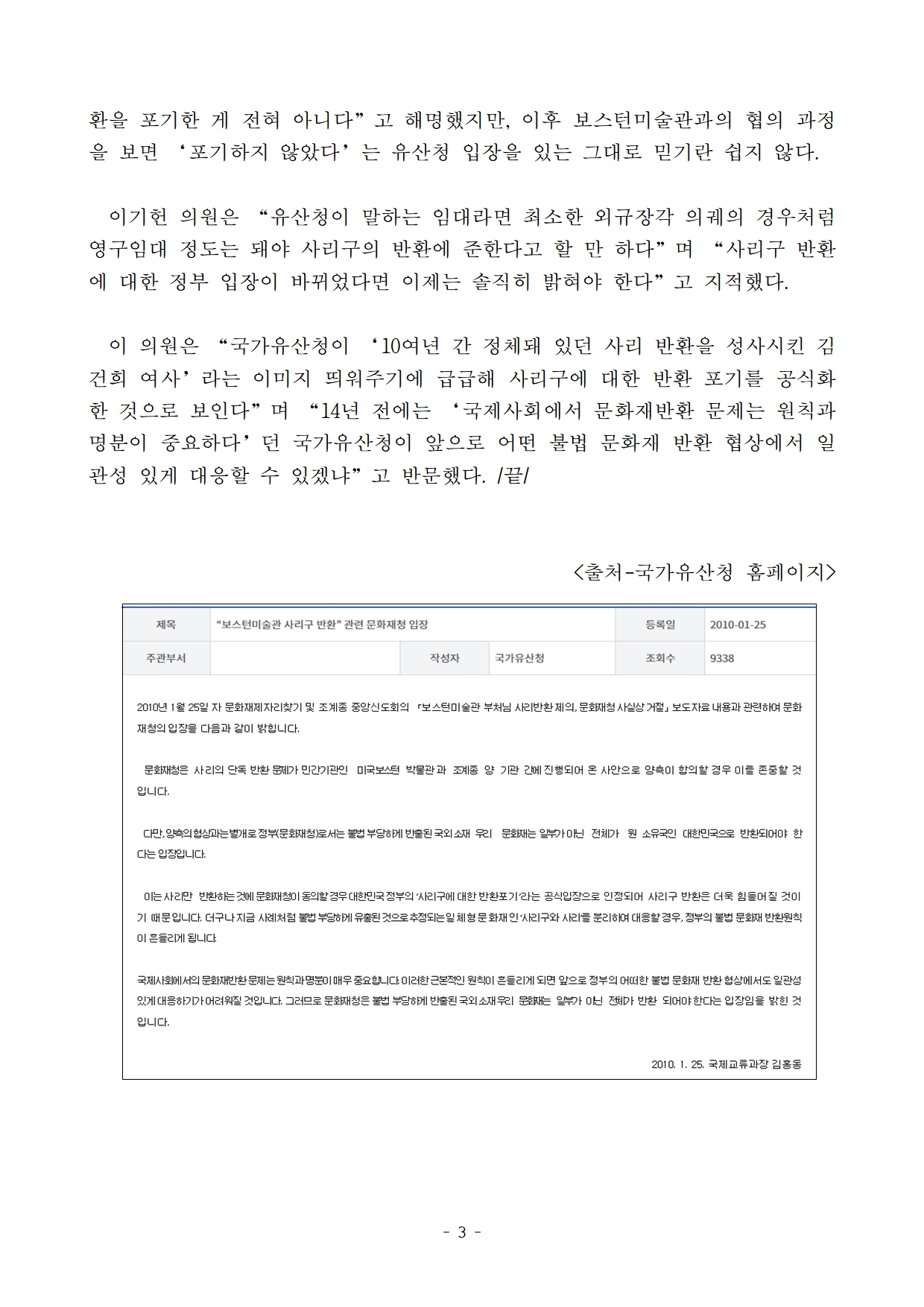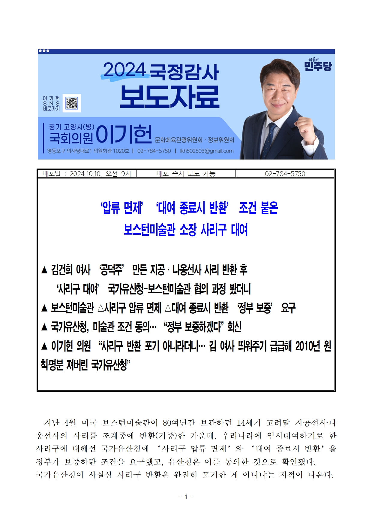 [이기헌 의원(고양시 병) 보도자료] '압류 면제' '대여 종료시 반환' 조건 붙은 보스턴미술관 소장 사리구 대여