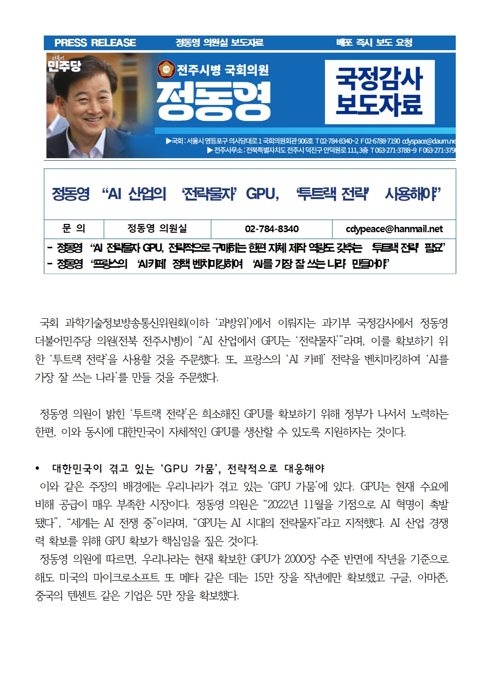 241008_정동영국정감사_정동영_“AI_산업의_‘전략물자’GPU_‘투트랙_전략’_사용해야”.hwp