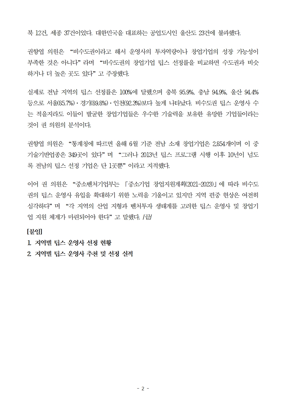 [국회의원 권향엽] 중기부 팁스 운영사 지역 편중 심각… 전남은 1곳뿐