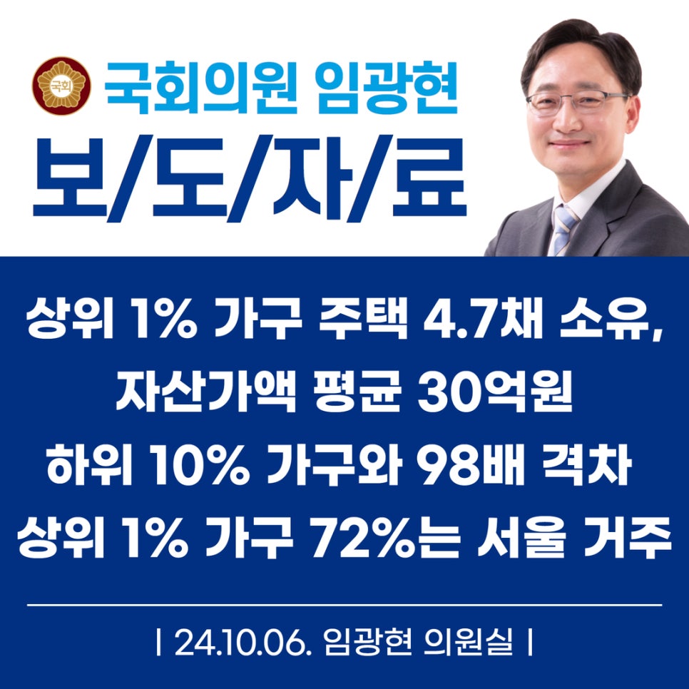 [임광현의원 국감 보도] 상위 1% 가구 주택 4.7채 소유, 자산가액 평균 30억원하위 10% 가구와 98배 격차 상위 1% 가구 72%는 서울 거주