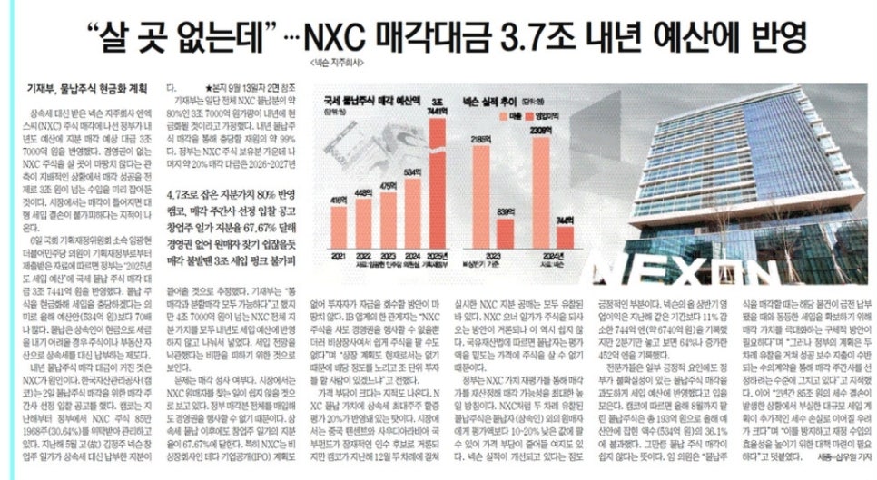그럼에도 정부는 엔엑스씨 물납주식의 약 80%인 3조7,000억원 가량이 내년에 현금화될 것이라고 가정하여 세입예산을 편성했다. 내년 물납주식 매각을 통해 충당할 재원 전체의 약 99%를 차지하는 규모다. 지난 8월까지 매각된 물납주식은 총 193억 원으로 올해 예산액 534억원의 36.1%에 불과한 상황이다.