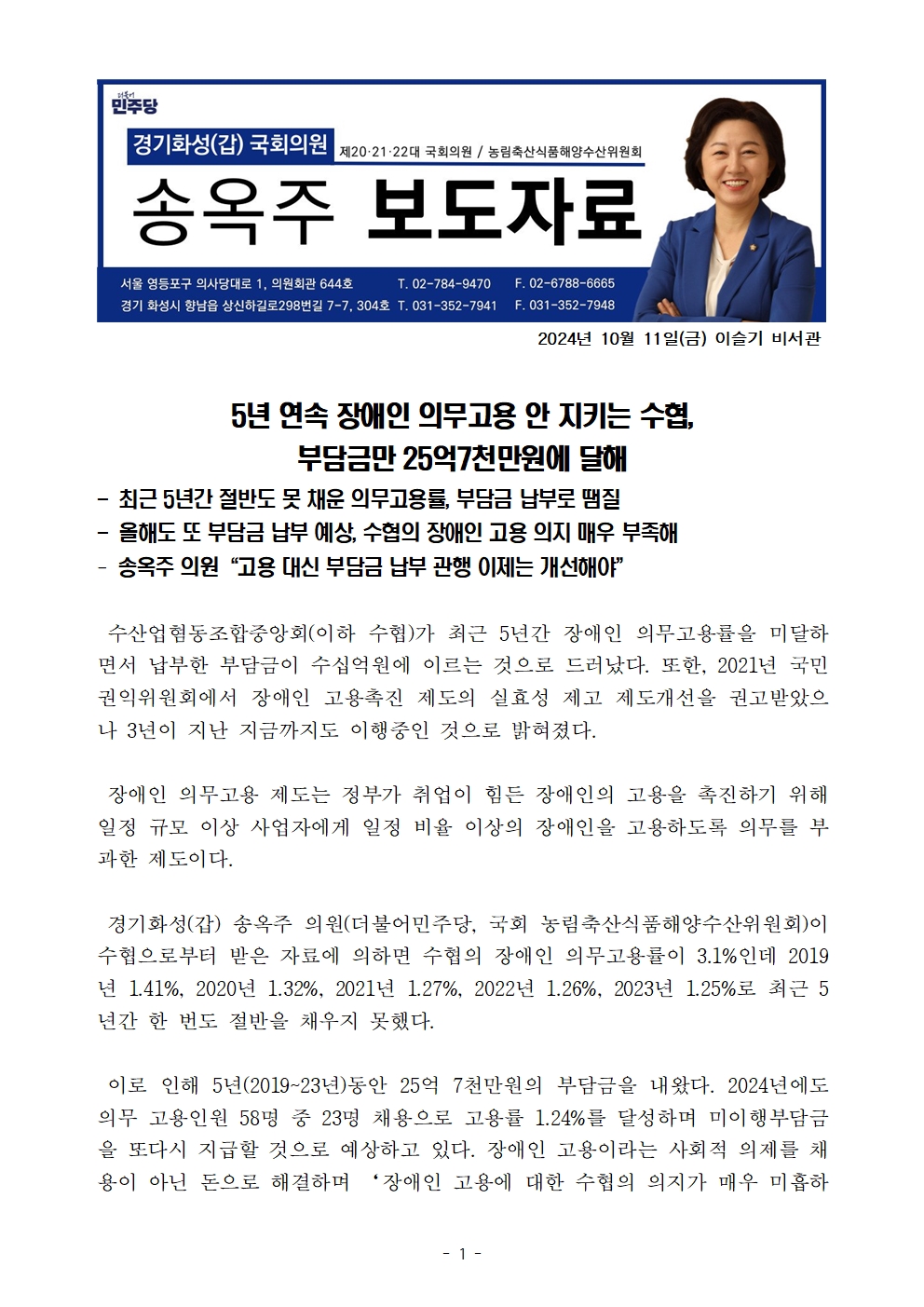 [국회의원 송옥주 국정감사 보도자료] 5년 연속 장애인 의무고용 안 지키는 수협, 부담금만 25억7천만원에 달해