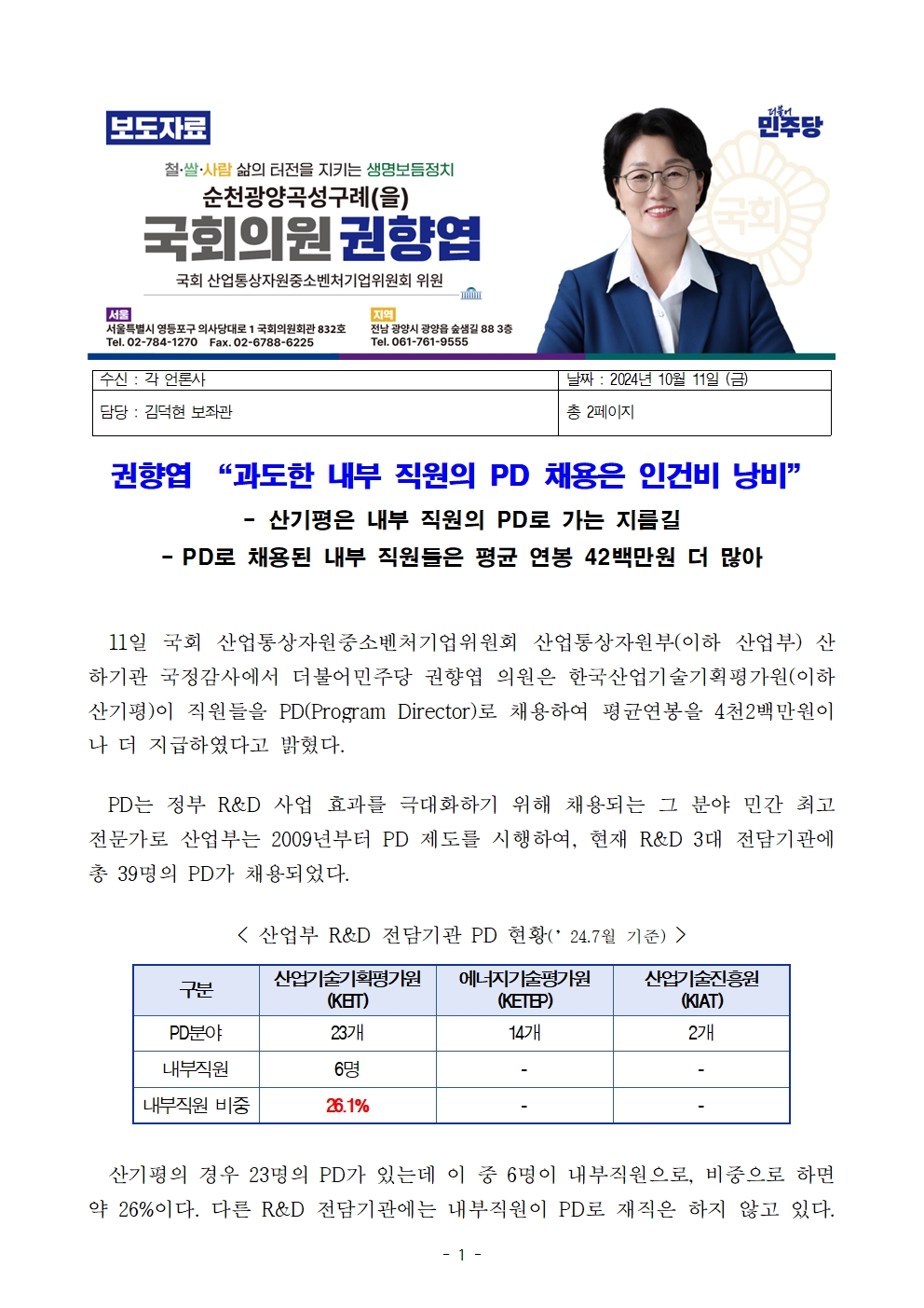 [국회의원 권향엽] 권향엽 “과도한 내부 직원의 PD 채용은 인건비 낭비”