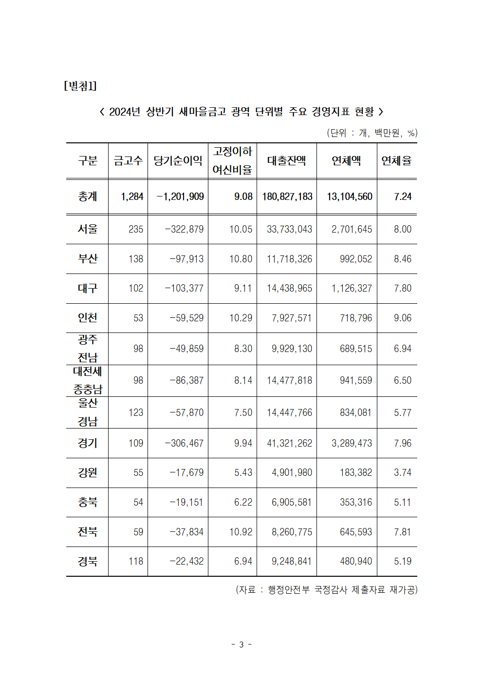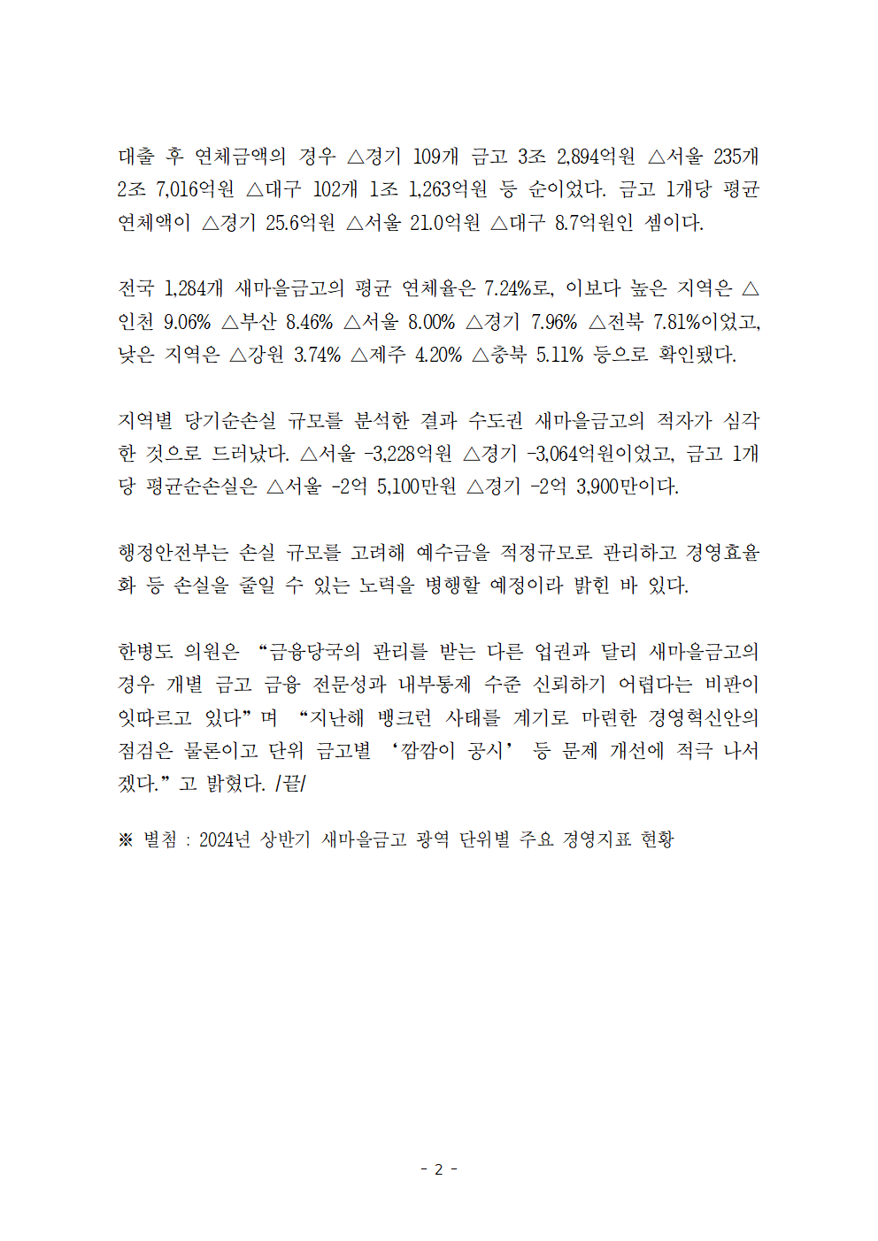 [한병도의원]2024행안위국정감사보도자료(1)_새마을금고 부실자산 비율 전북이 10.9%로 전국서 가장 높아.hwp