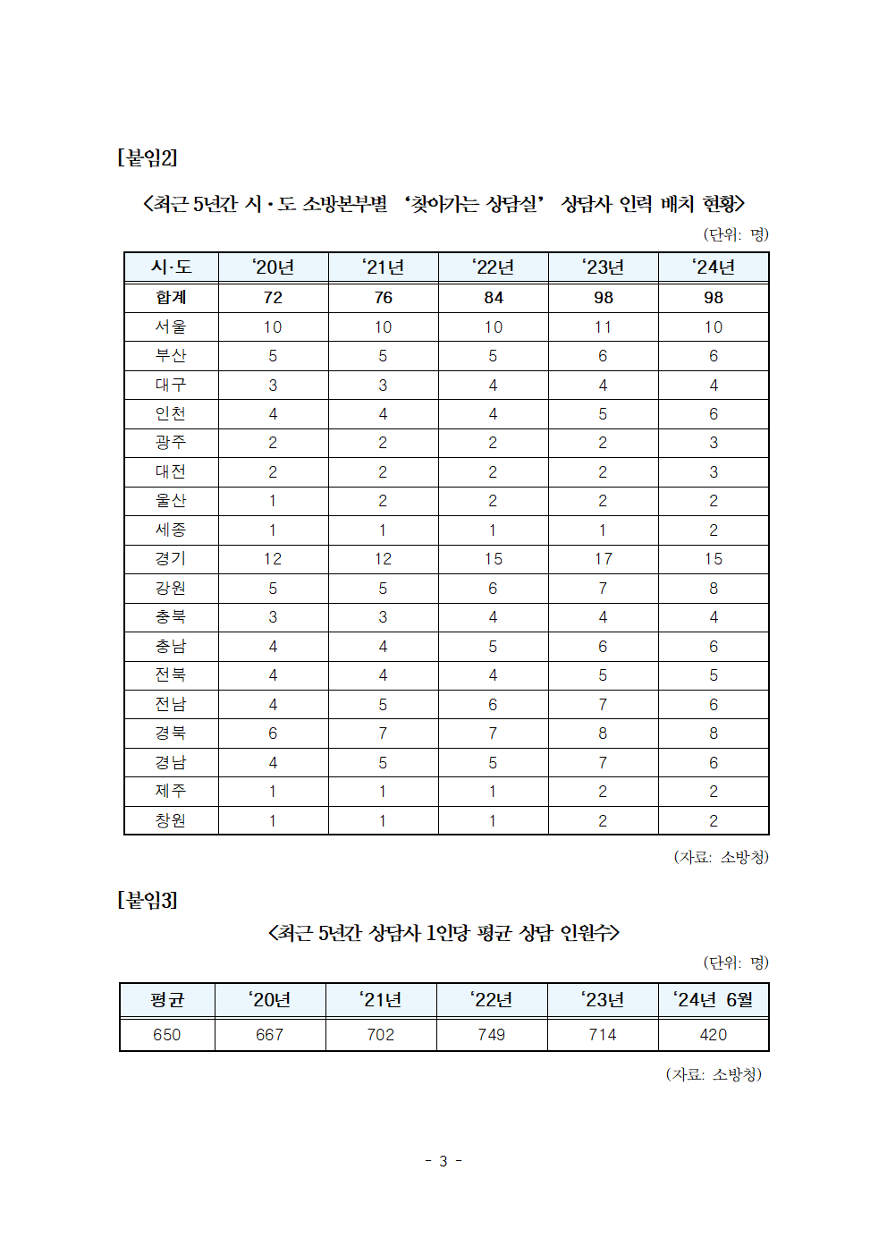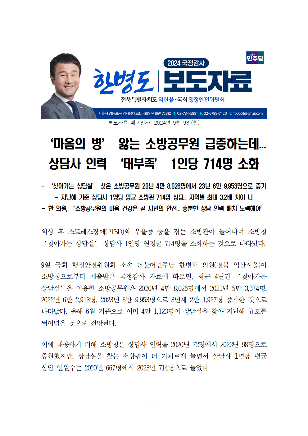 [한병도의원]2024행안위국정감사보도자료(7)_‘마음의 병’ 앓는 소방공무원 급증하는데... 상담사 인력 ‘태부족’ 1인당 714명 소화.hwp