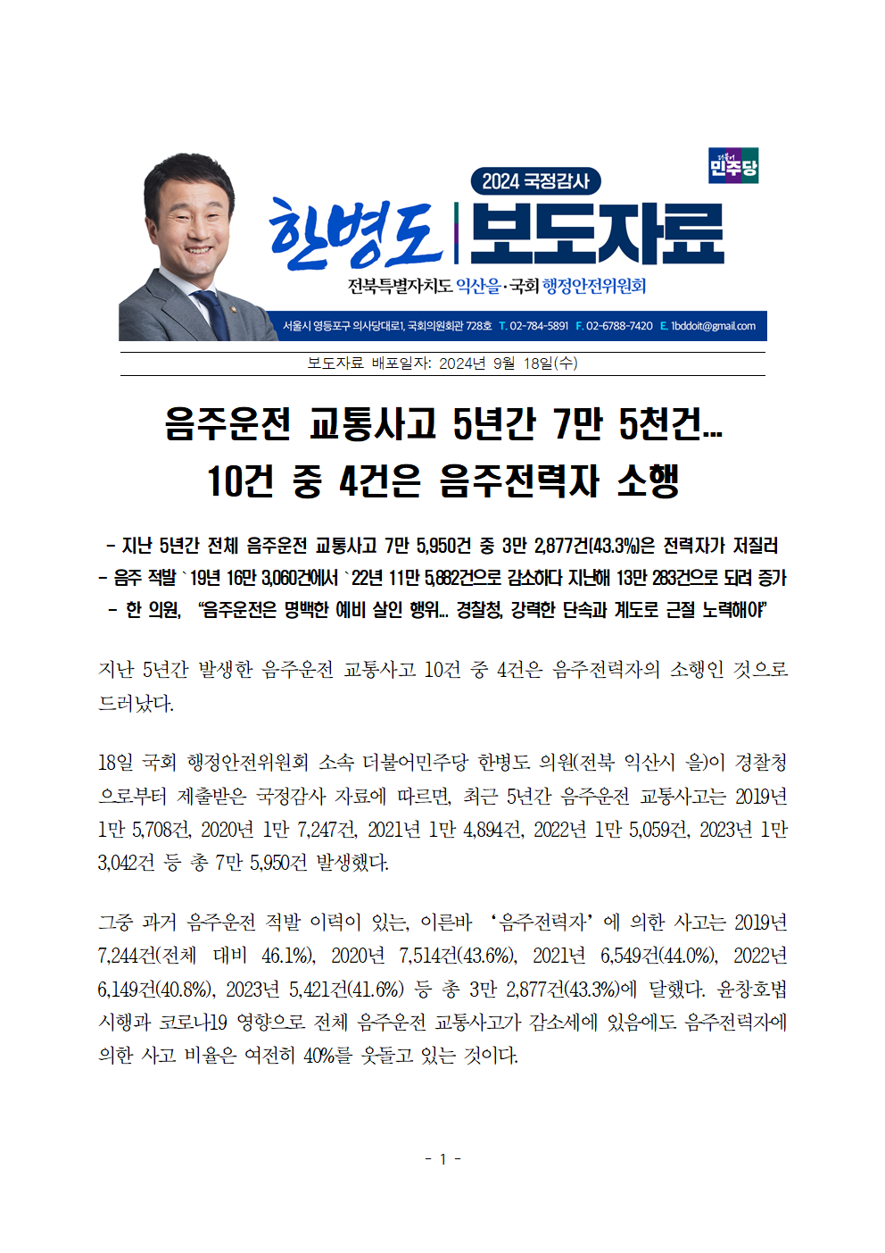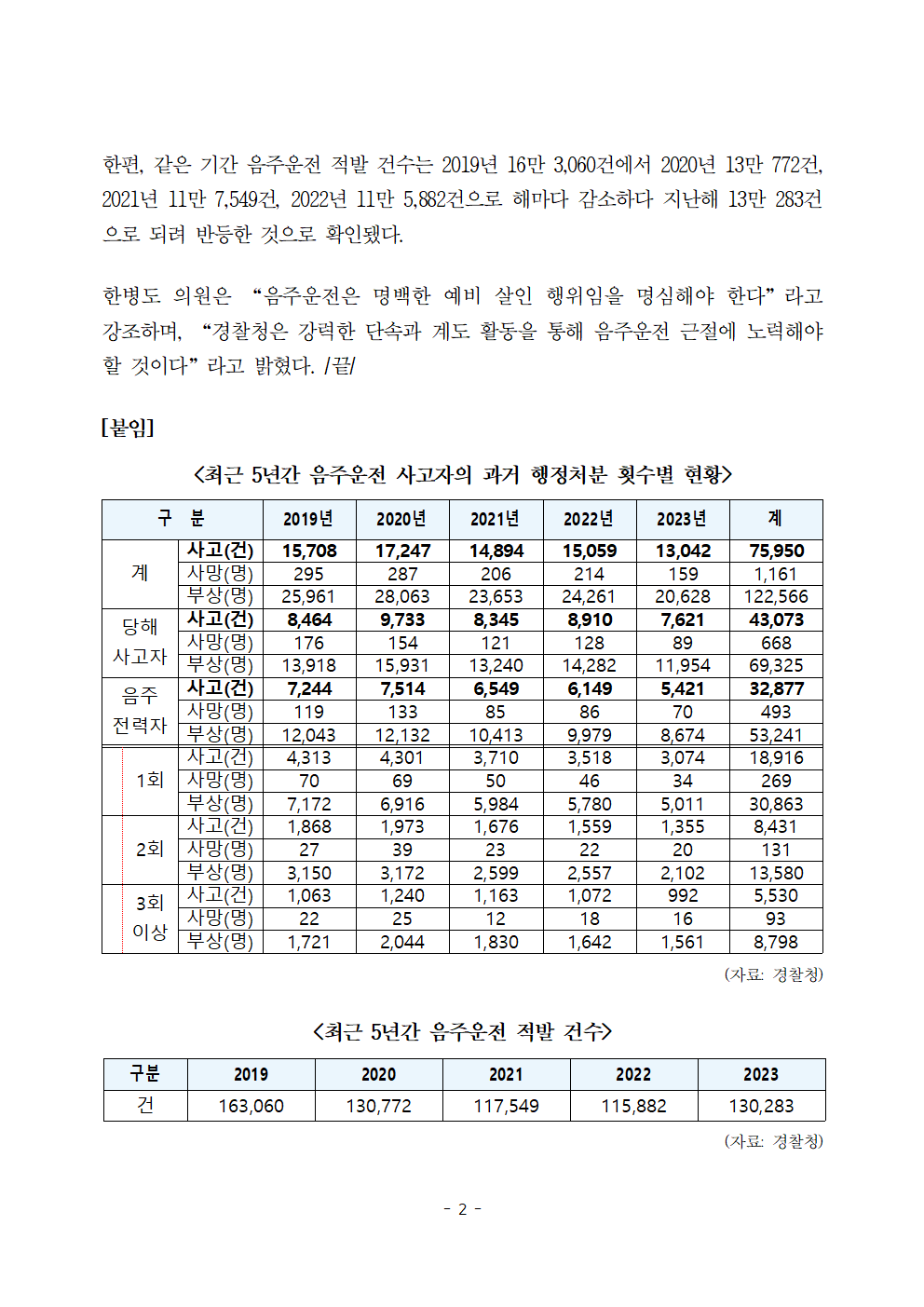 [한병도의원]2024행안위국정감사보도자료(15)음주운전 교통사고 5년간 7만 5천건... 10건 중 4건은 음주전력자 소행.hwp