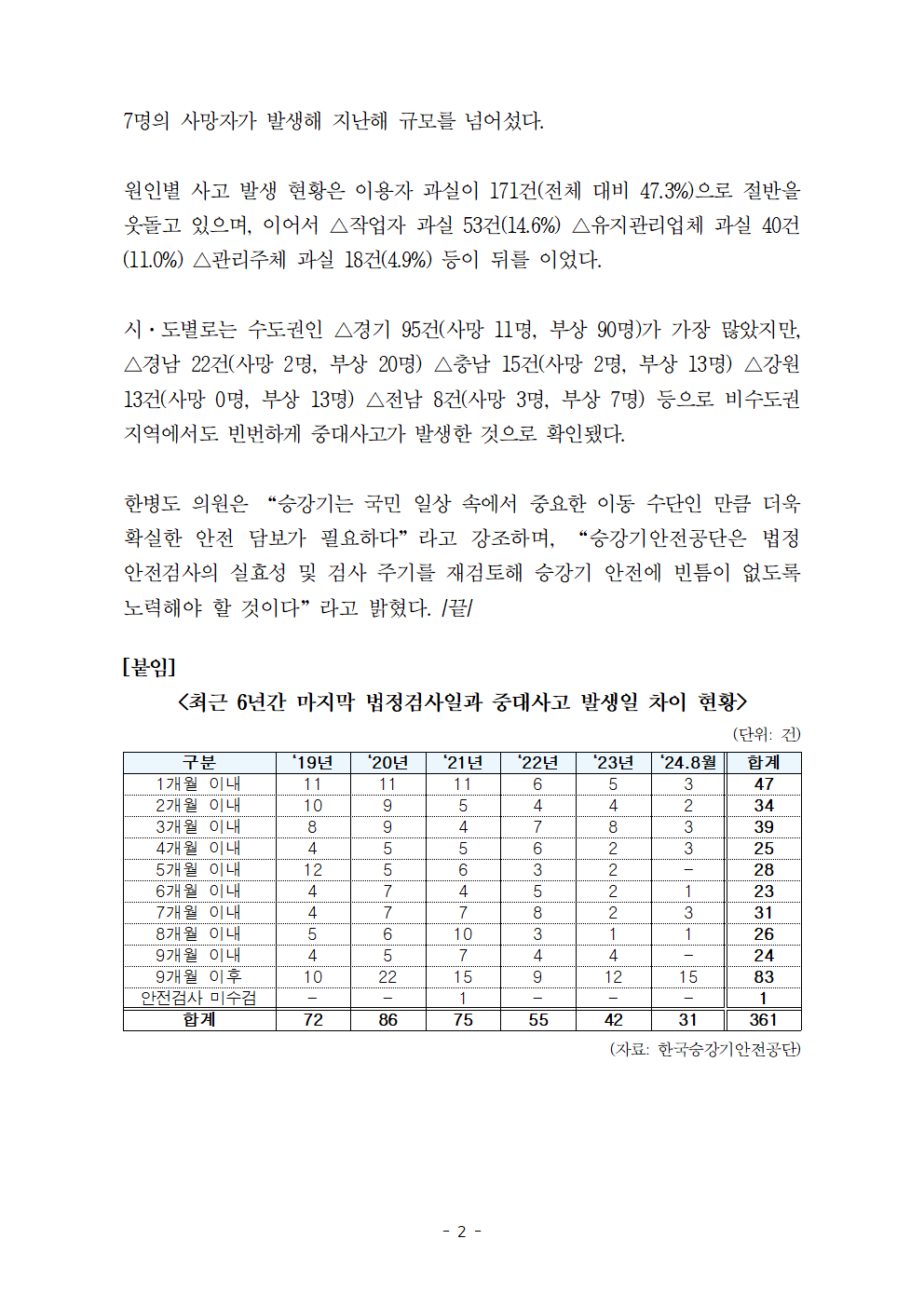 [한병도의원]2024행안위국정감사보도자료(20)안전검사 받아도 반 년 채 못 넘겨…승강기 중대사고 사상자 연평균 63명.hwp