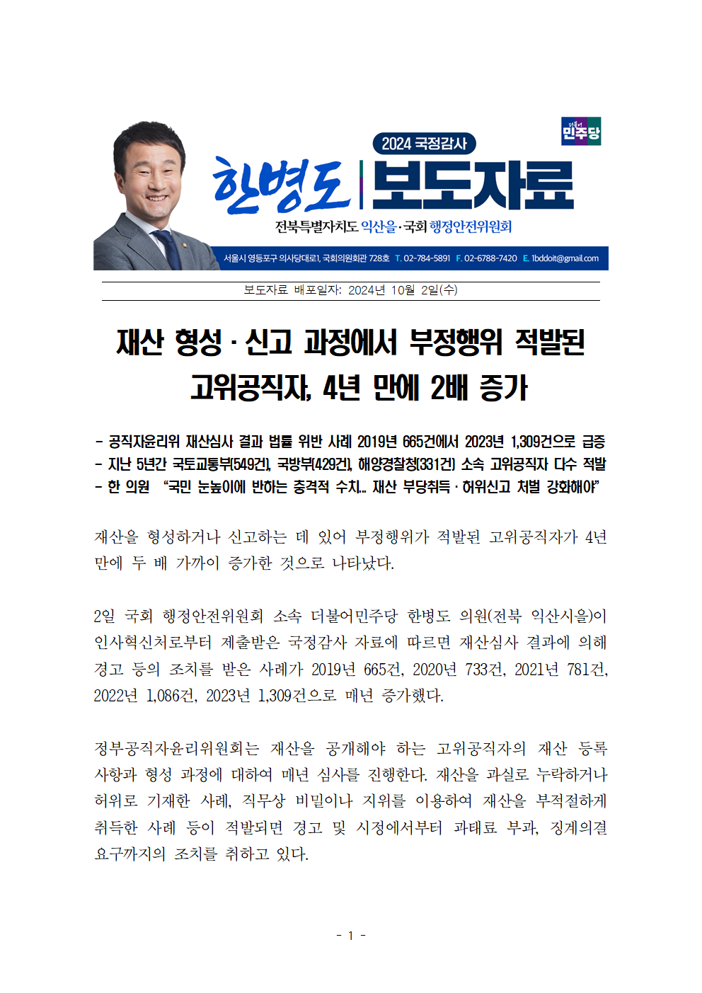 [국회의원 한병도 국정감사] 재산 형성·신고 과정에서 부정행위 적발된 고위공직자, 4년 만에 2배 증가