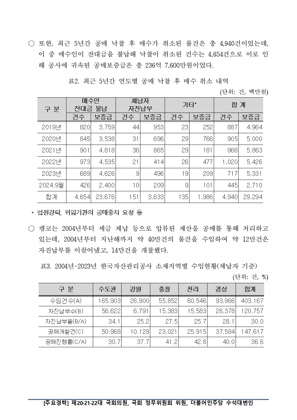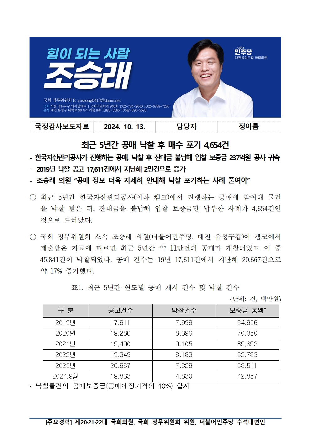 [국회의원 조승래] 최근 5년간 공매 낙찰 후 매수 포기 4,654건