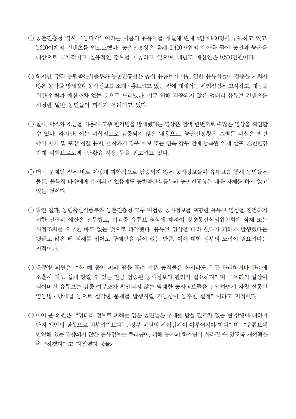[윤준병 의원 국정감사 보도자료] 엉터리 농사정보 유튜브 확산에도_ 농식품부·농진청 대응은 제로!