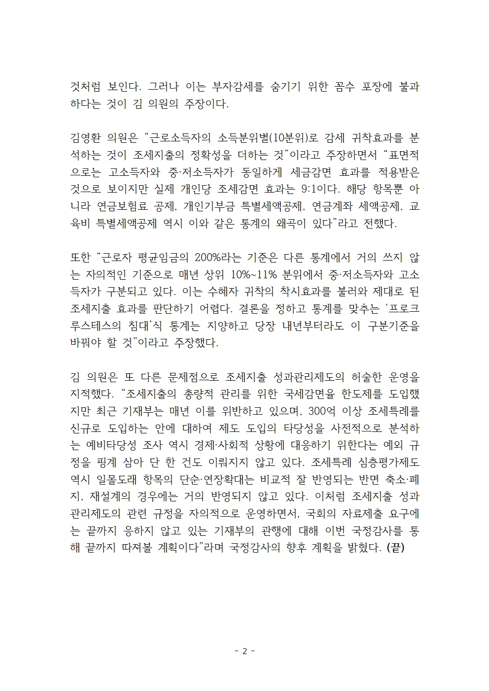 [김영환 의원(고양시 정) 보도자료] 김영환, "기재부, 부자감세 감추려 조세지출 수혜자 귀착 효과 분석 시, 작위적 기준 적용하여 착시 유발"