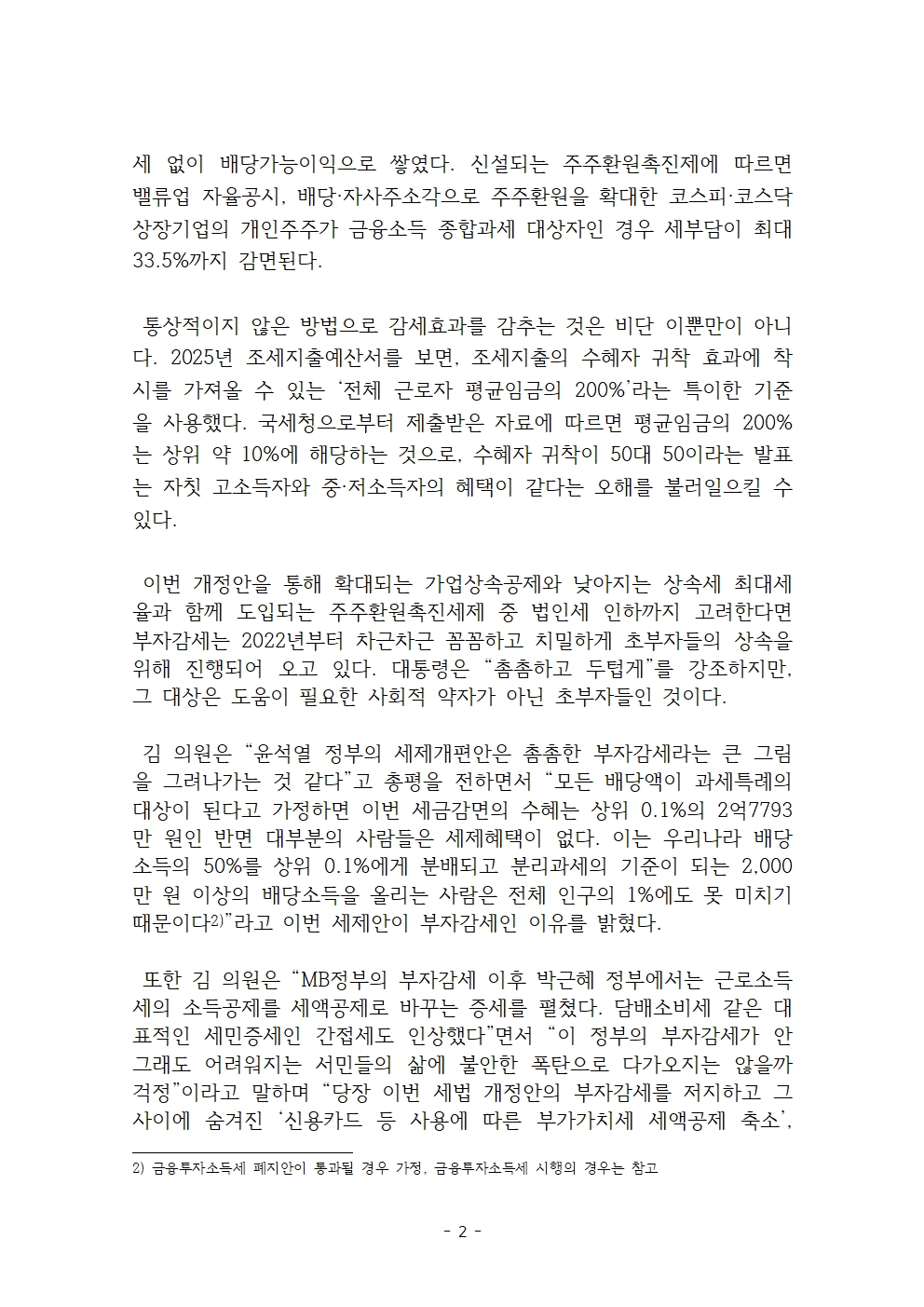 [김영환 의원(고양시 정) 보도자료] 김영환, "기재부, 부자감세 감추려 조세지출 수혜자 귀착 효과 분석 시, 작위적 기준 적용하여 착시 유발"