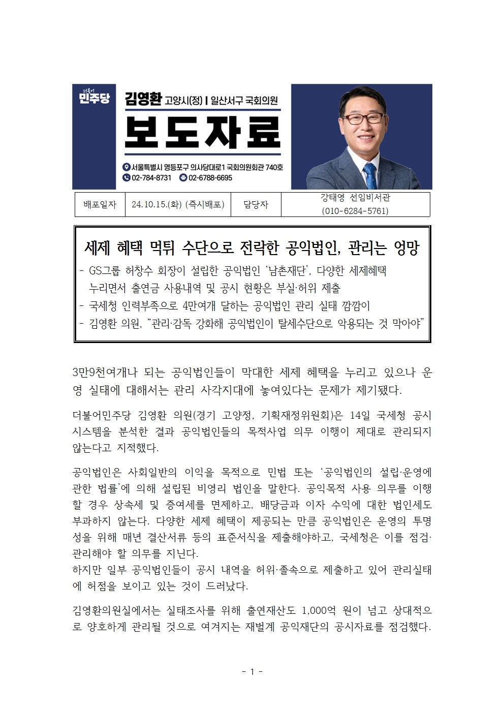 [김영환 의원(고양시 정) 보도자료] 세제 혜택 먹튀 수단으로 전락한 공익법인, 관리는 엉망