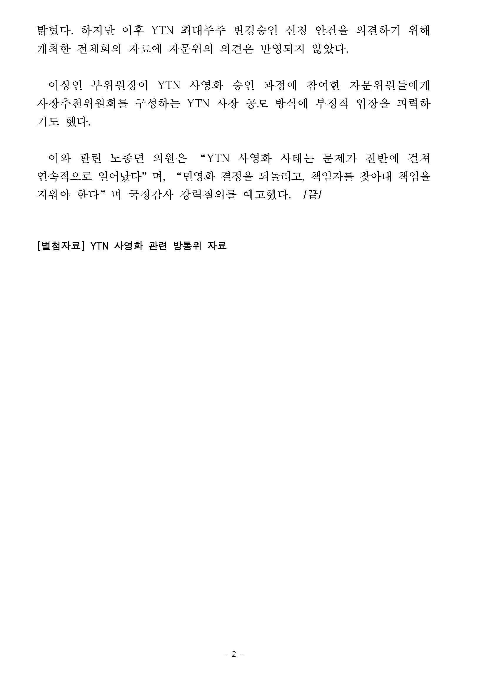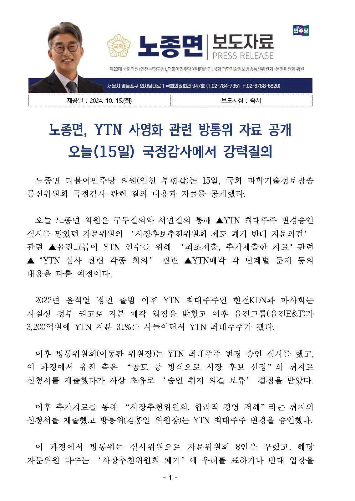 [국회의원 노종면(부평구갑) 보도자료] 노종면, YTN 사영화 관련 방통위 자료 공개 - 오늘(15일) 국정감사에서 강력질의