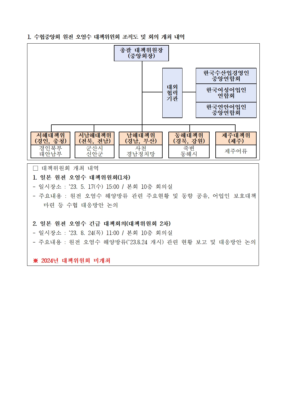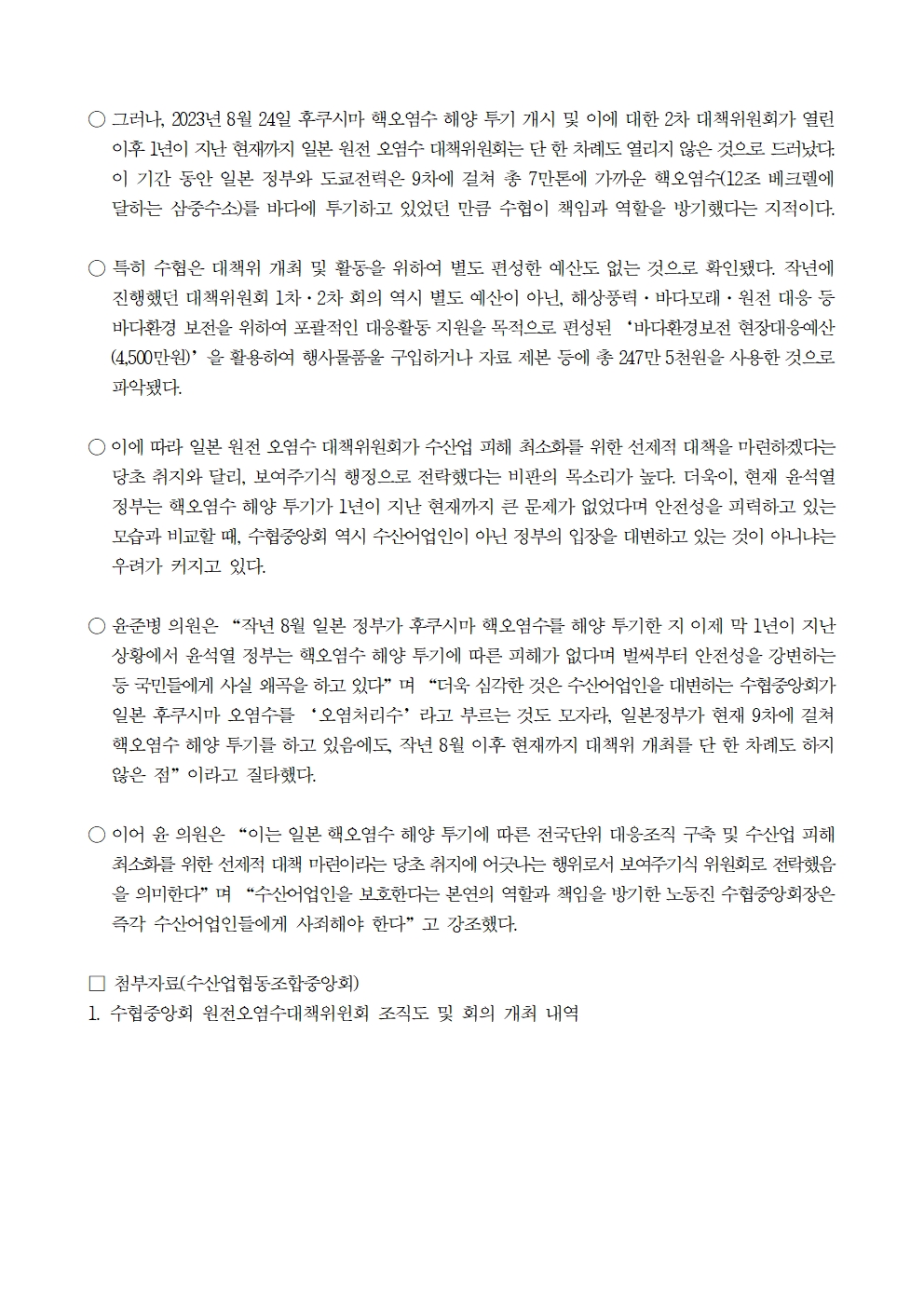 241014 [윤준병 의원 국정감사 보도자료] “수협의 일본원전 오염수 대책위원회 올해 단 한 차례도 안 열려!” .hwp