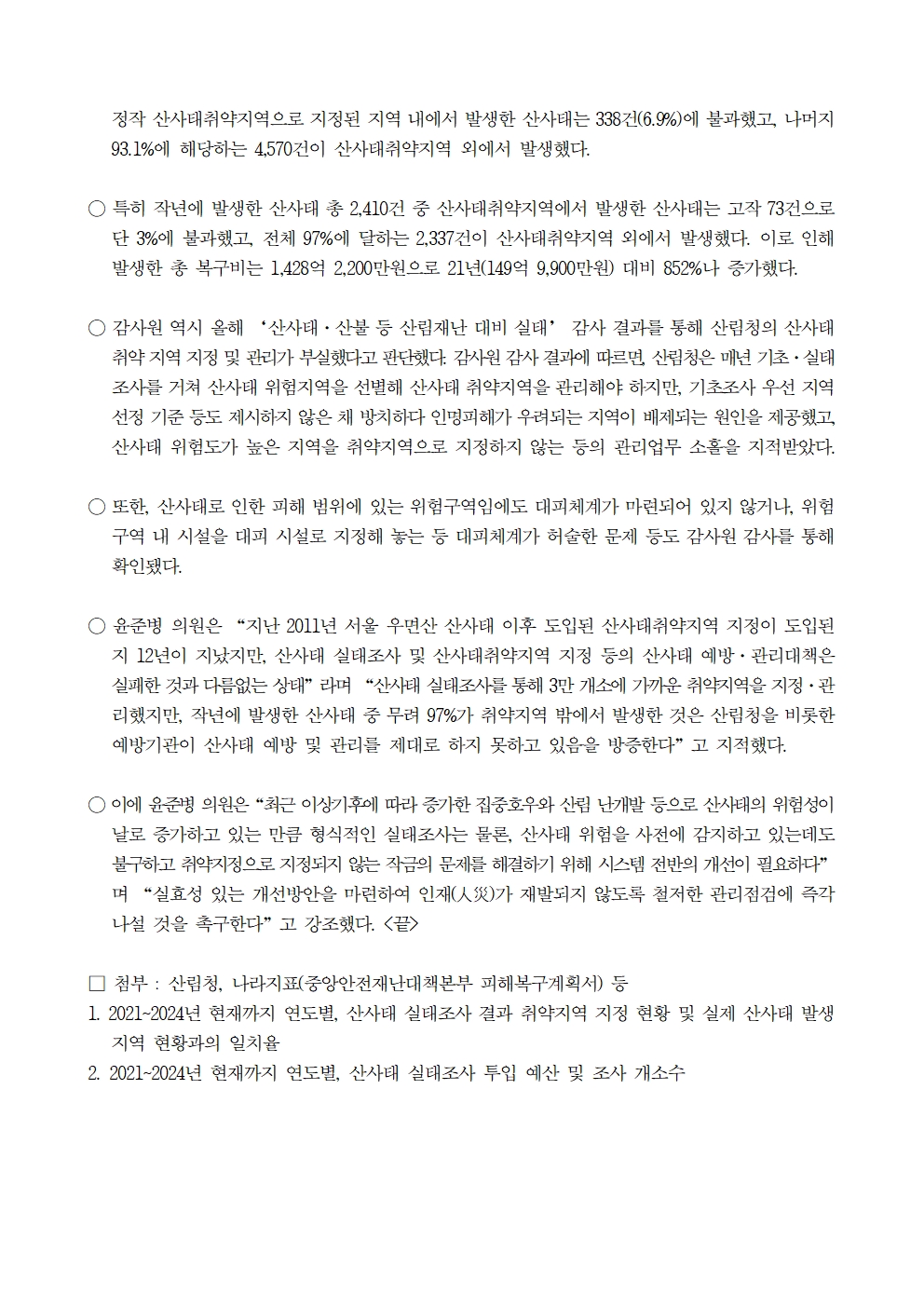 241015 [윤준병 의원 국정감사 보도자료] 윤준병 의원_ 작년 산사태 97%가 산사태취약지역 밖에서 발생!.hwp