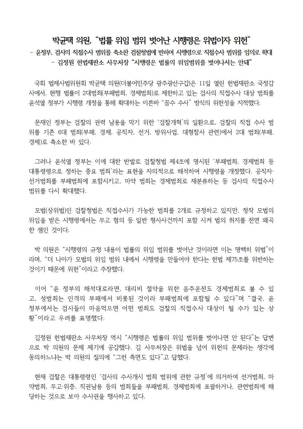 [박균택 의원 국정감사 보도자료] 박균택 의원, “법률 위임 범위 벗어난 시행령은 위법이자 위헌”