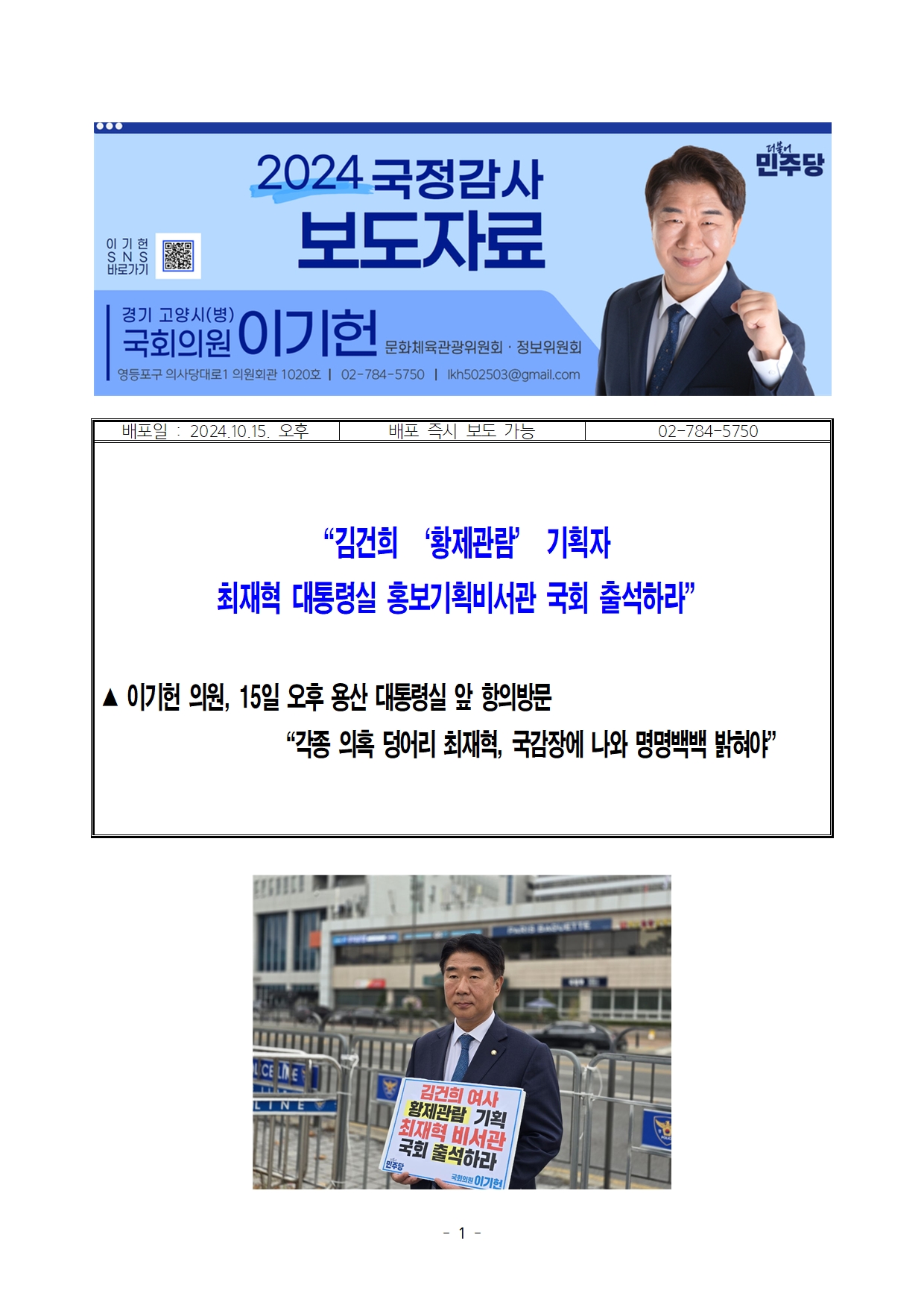 [이기헌 의원(고양시 병) 보도자료]이기헌의원, 대통령실 앞 항의방문 "김건희 황제관람 기획자 최재혁 대통령실 홍보기획비서관 국회 출석하라"