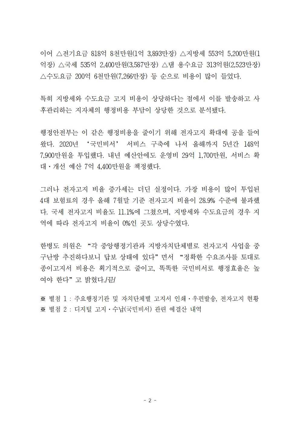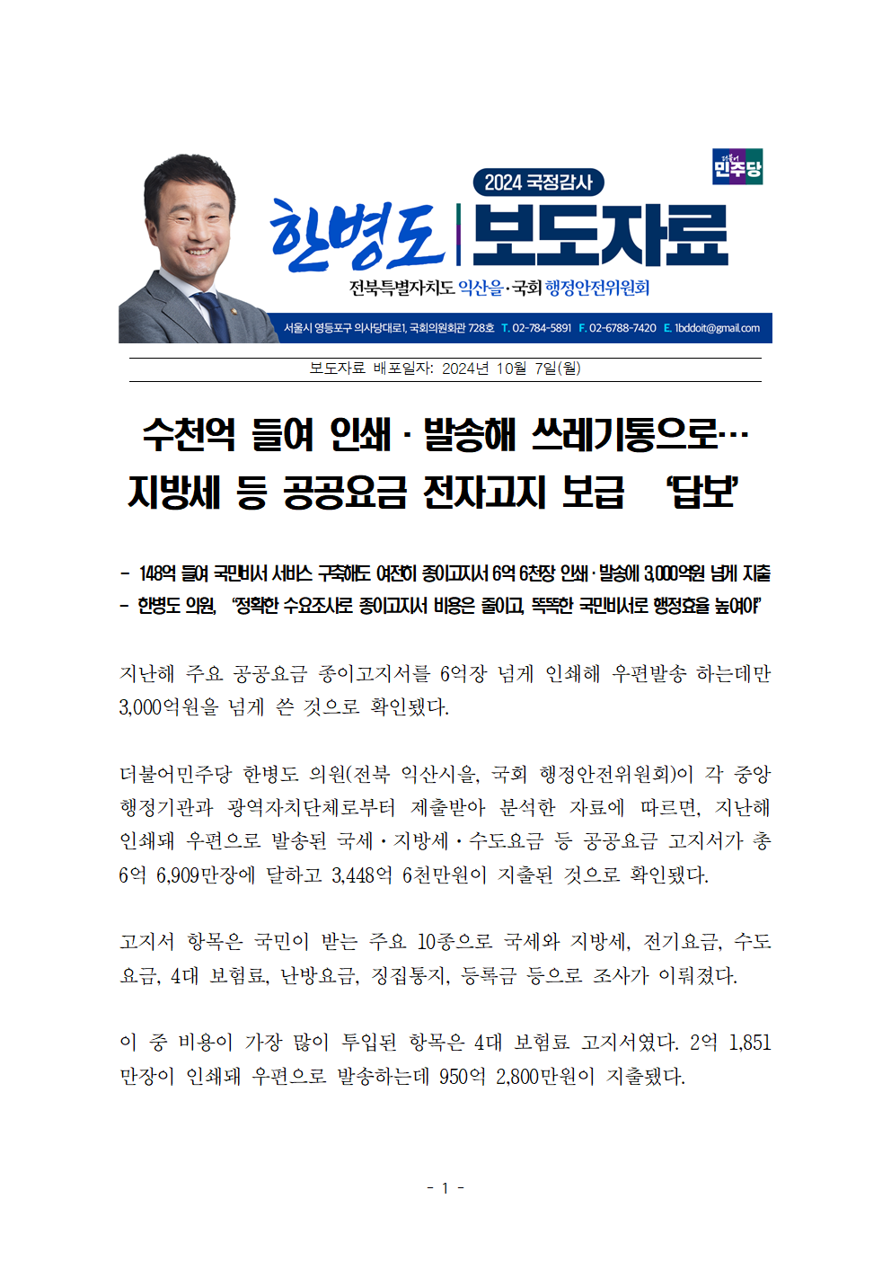 [한병도의원]2024행안위국정감사보도자료(29) 수천억 들여 인쇄·발송해 쓰레기통으로…지방세 등 공공요금 전자고지 보급 ‘답보’.hwp