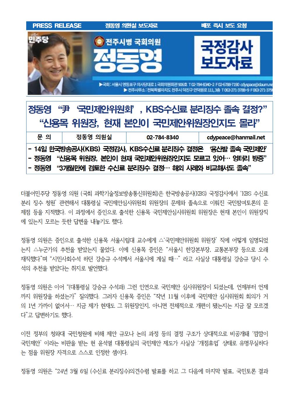 [국회의원 정동영 국감보도자료] 정동영 “尹‘국민제안위원회’, KBS수신료 분리징수 졸속 결정?” “신용목 위원장, 현재 본인이 국민제안위원장인지도 몰라”