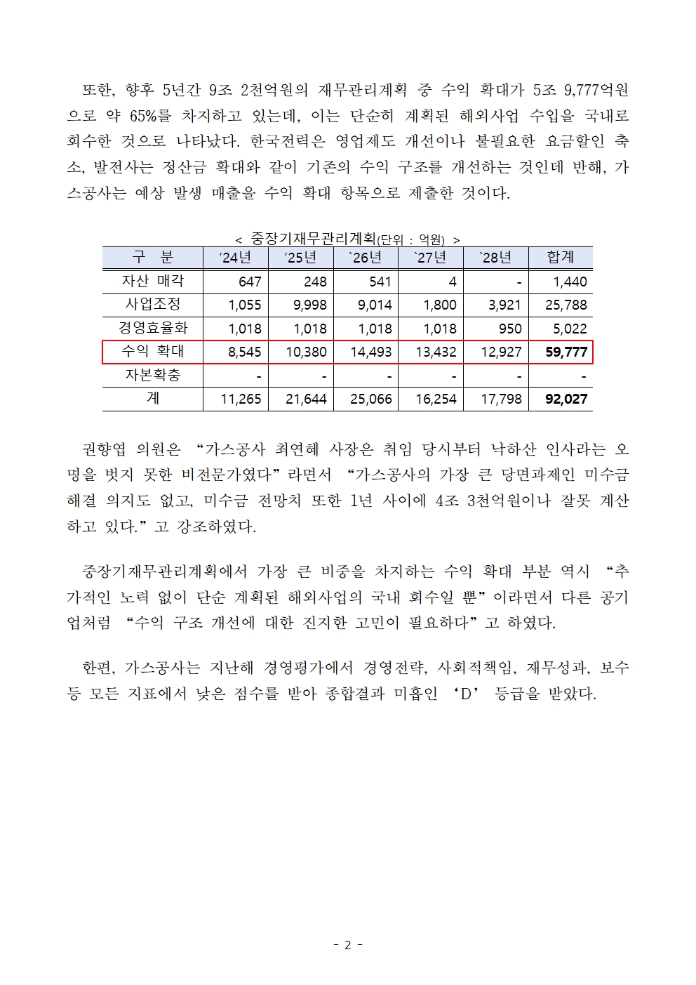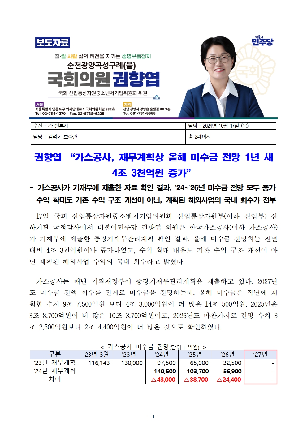 [권향엽 국회의원] 241017 보도자료_가스공사 1년 사이 재무계획상 올해 미수금 전망 4조3천억원 증가.hwp