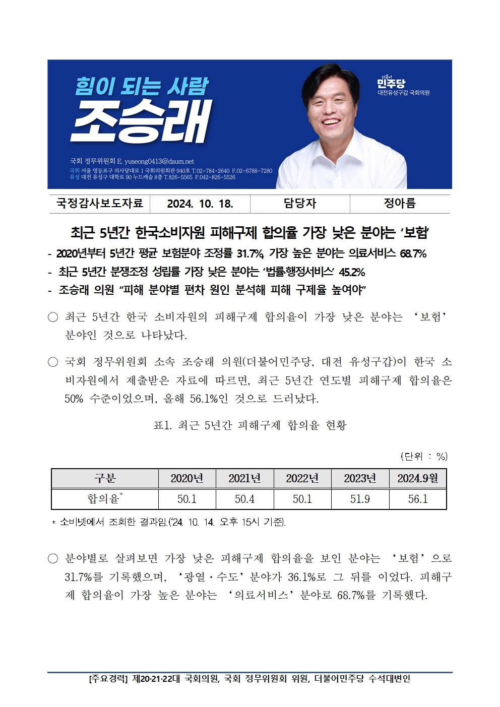 [국회의원 조승래] 최근 5년간 한국소비자원 피해구제 합의율 가장 낮은 분야는 ‘보험’