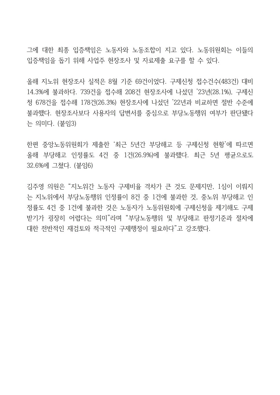 한편 중앙노동위원회가 제출한 ‘최근 5년간 부당해고 등 구제신청 현황’에 따르면 올해 부당해고 인정률도 4건 중 1건(26.9%)에 불과했다. 최근 5년 평균으로도 32.6%에 그쳤다. (붙임6)