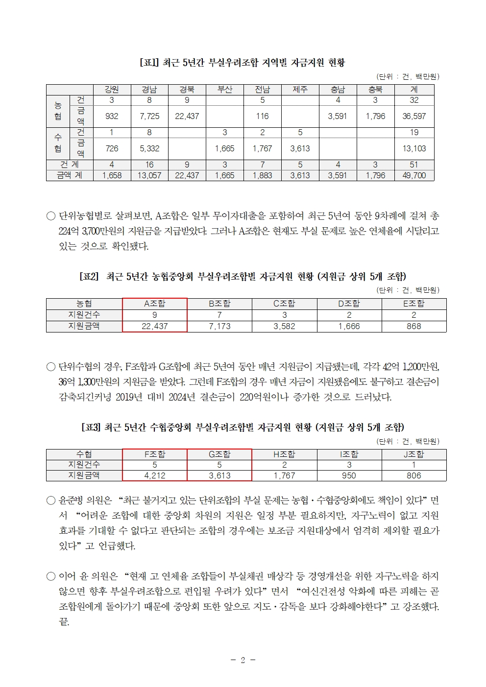 [윤준병 의원 국정감사 보도자료] 농협·수협_ 부실우려조합에 최근 5년여간 497억원 지원자금 지급