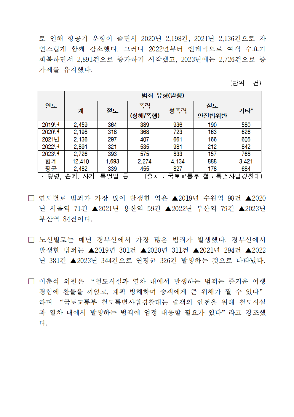 [국정감사 보도자료] 240922_이춘석 의원_ 철도시설 및 열차 내 범죄 매년 평균 2_500여 건 발생_ 성폭력이 최다.hwp