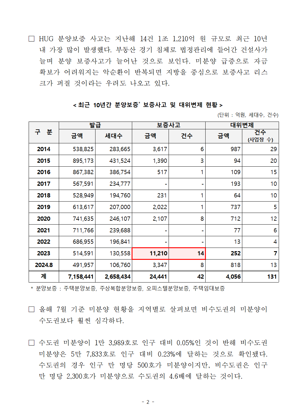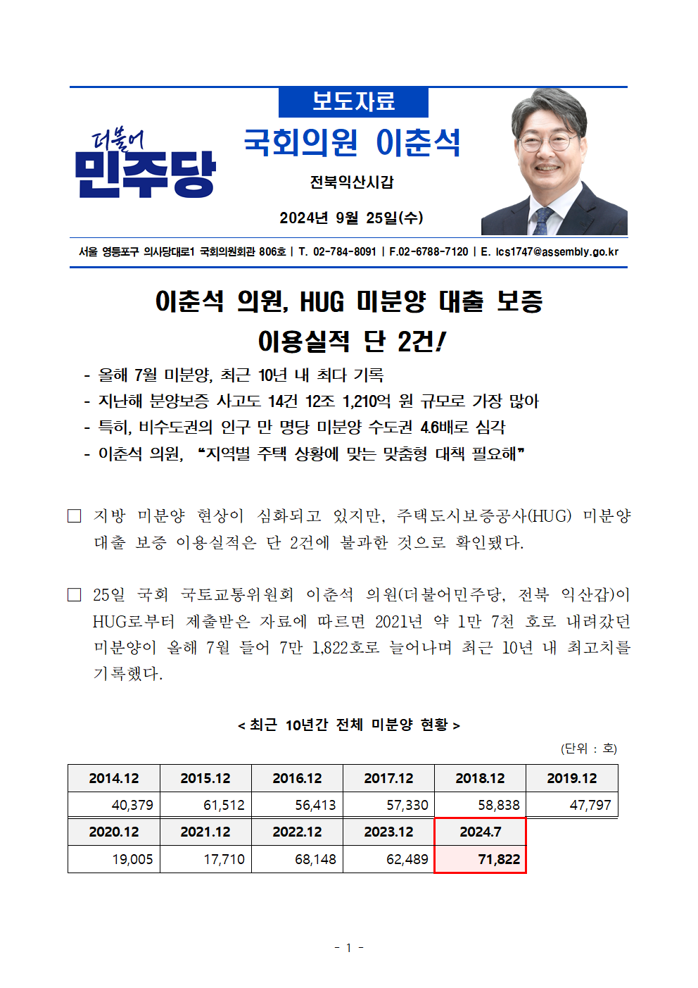 [국감 보도자료7] 240925_이춘석 의원_ HUG 미분양 대출 보증 이용실적 단 2건!.hwp