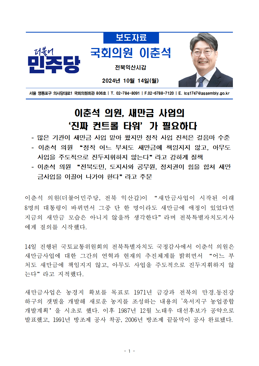 [국감_보도자료14]_241014_이춘석의원__새만금_사업의_진짜_컨트롤타워가_필요하다.hwp