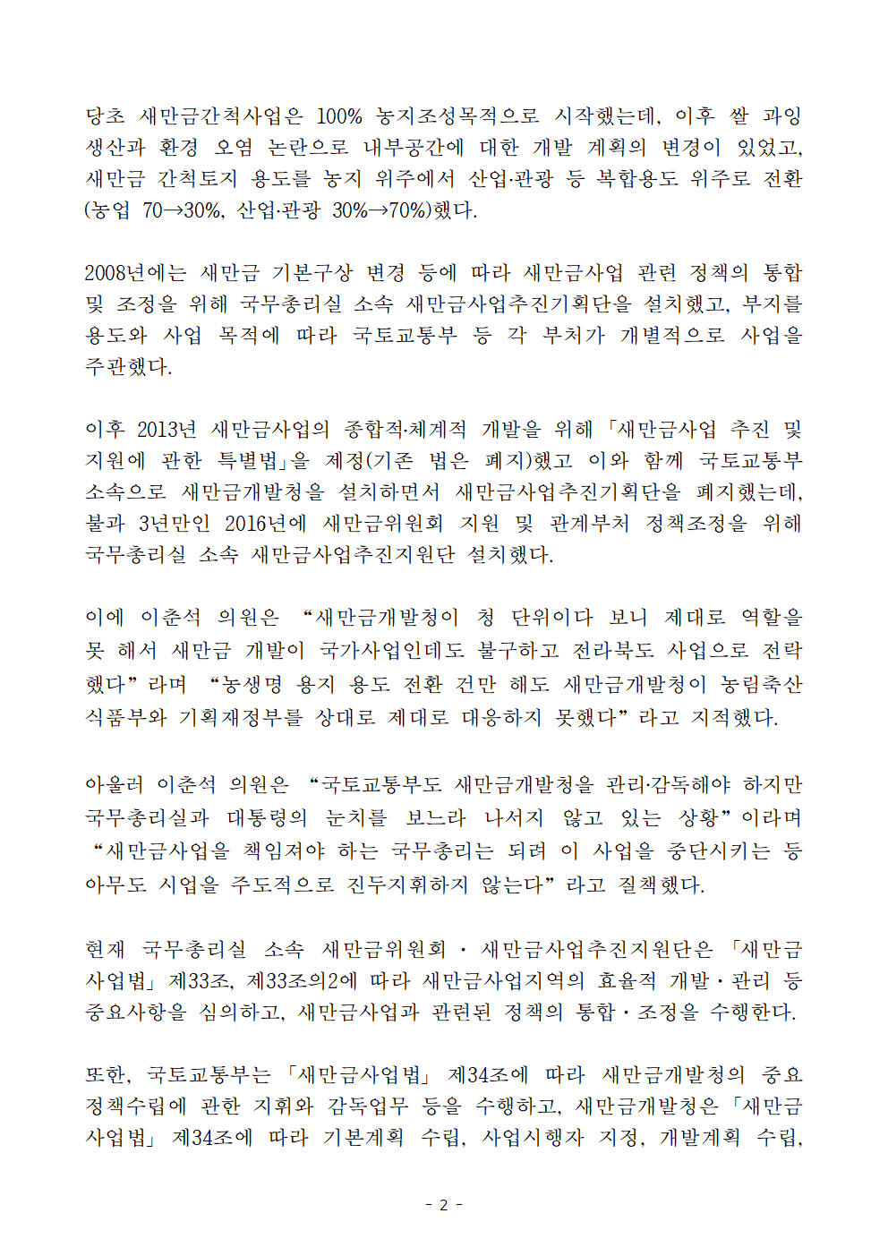 [이춘석 의원 국정감사 보도자료] 이춘석 의원, 새만금 사업의 ‘진짜 컨트롤 타워’가 필요하다
