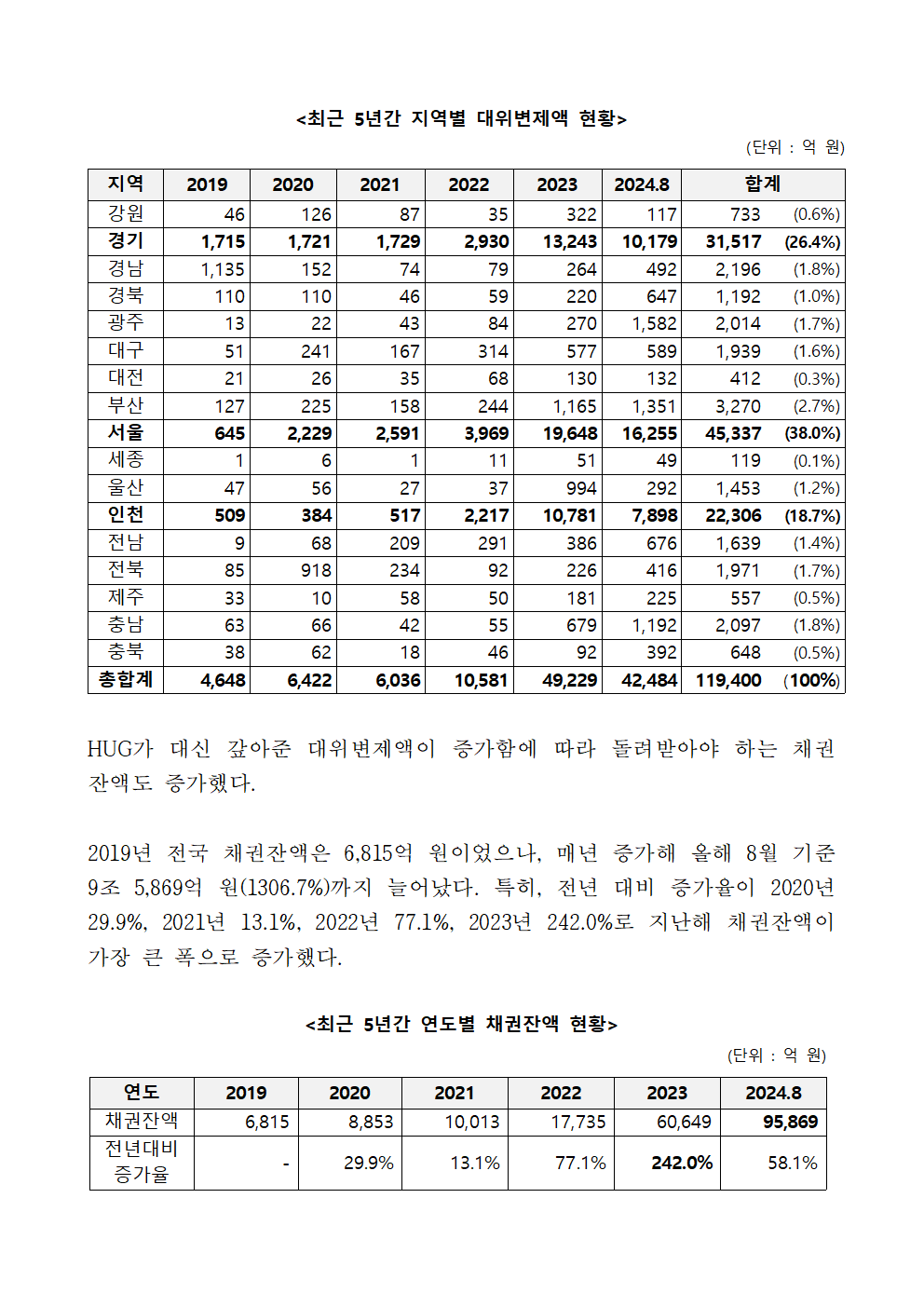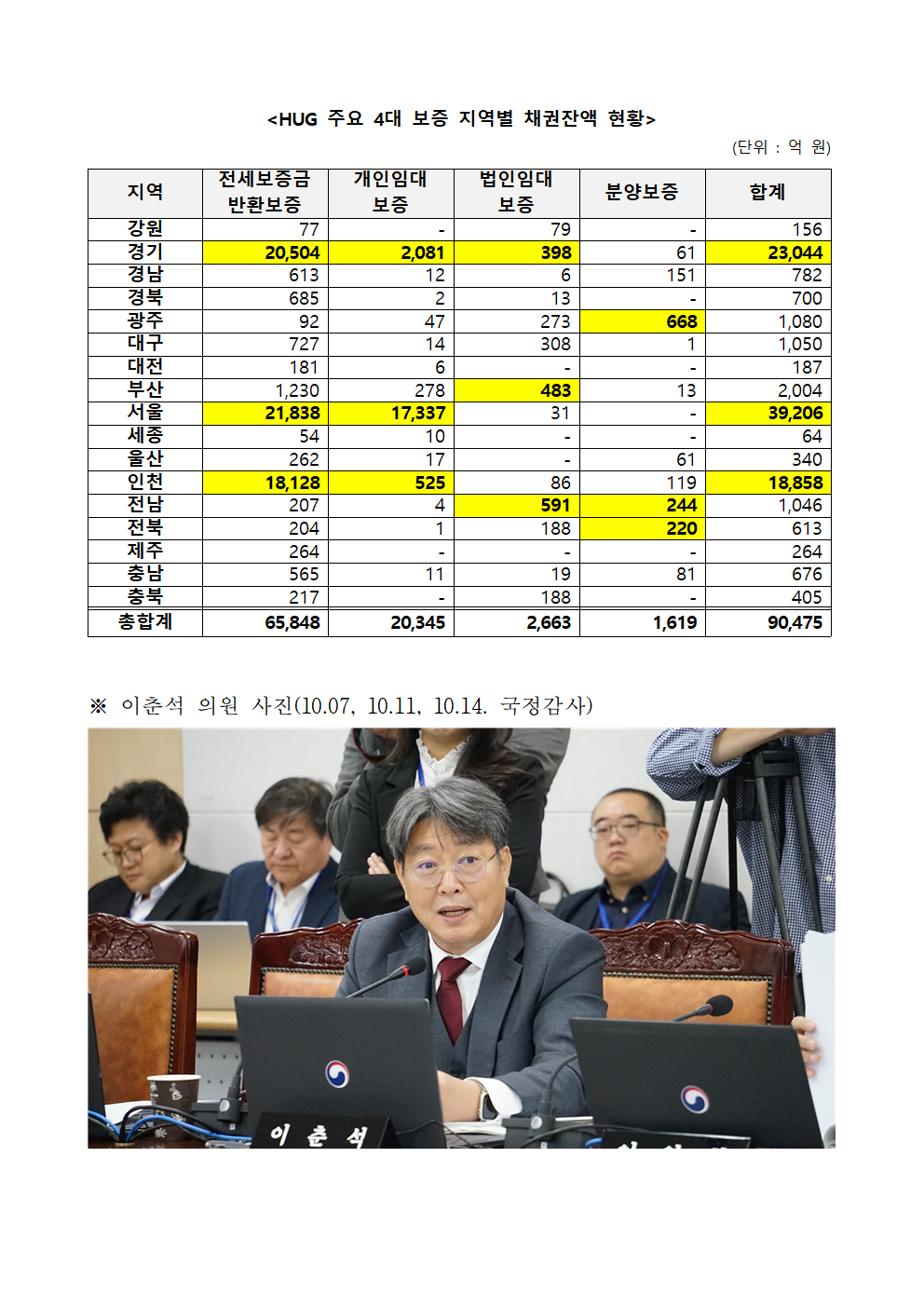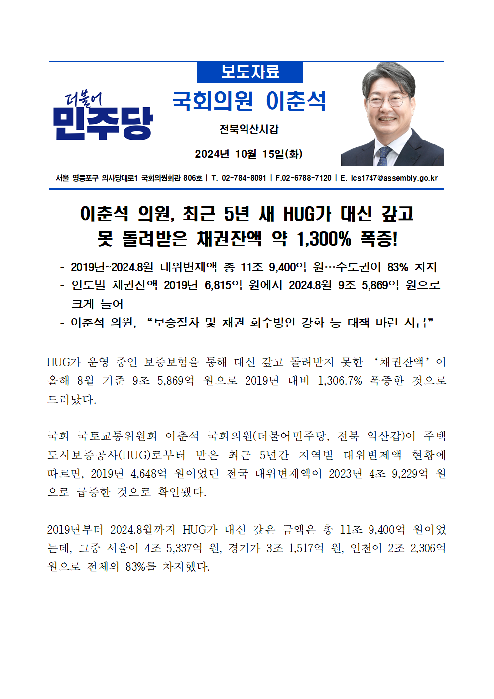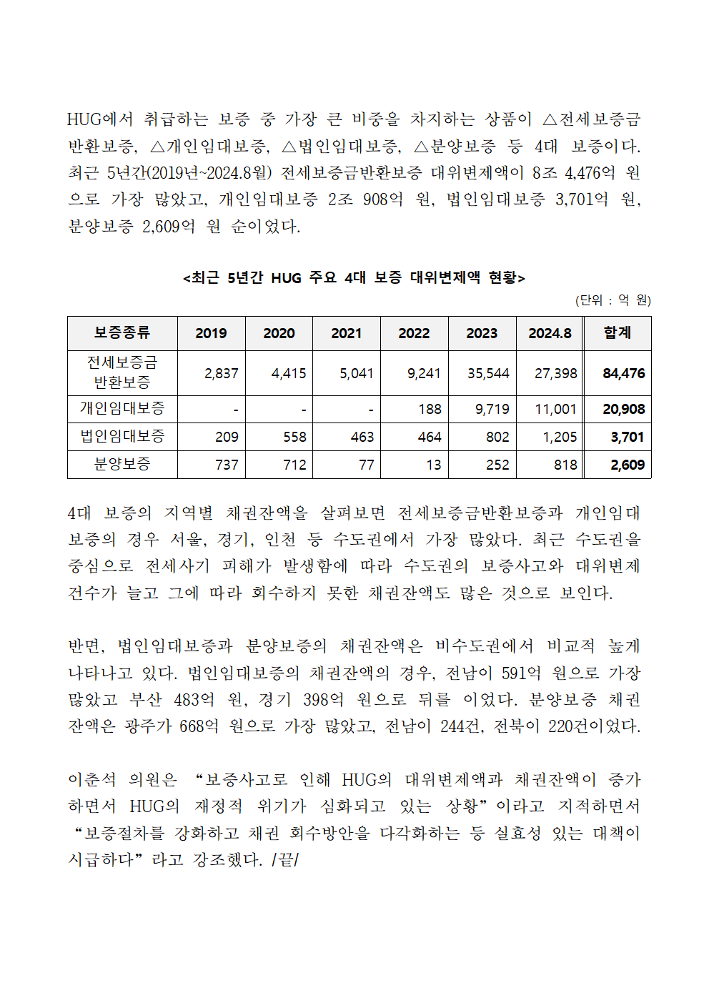 [이춘석 의원 국정감사 보도자료] 이춘석 의원, 최근 5년 새 HUG가 대신 갚고 못 돌려받은 채권잔액 약 1,300% 폭증!