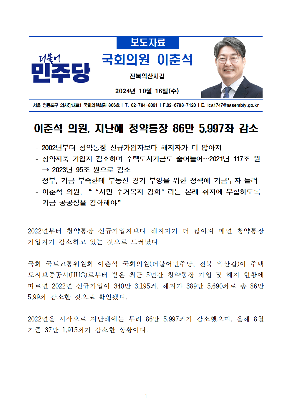 [국감_보도자료17]_241016_이춘석_의원__지난해_청약통장_86만_5_997좌_감소.hwp