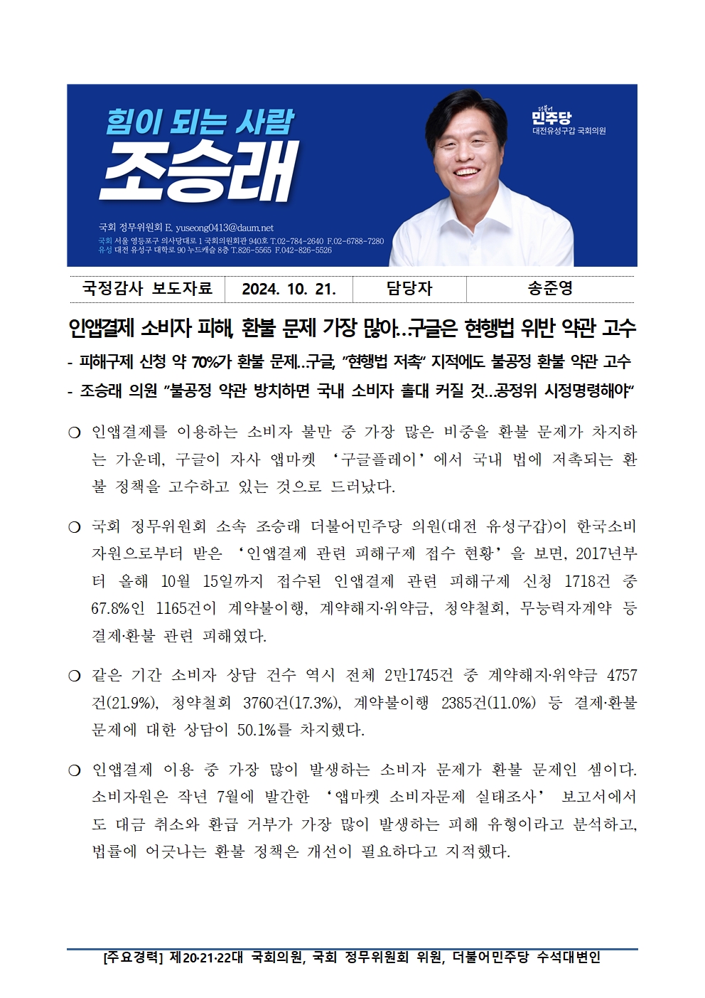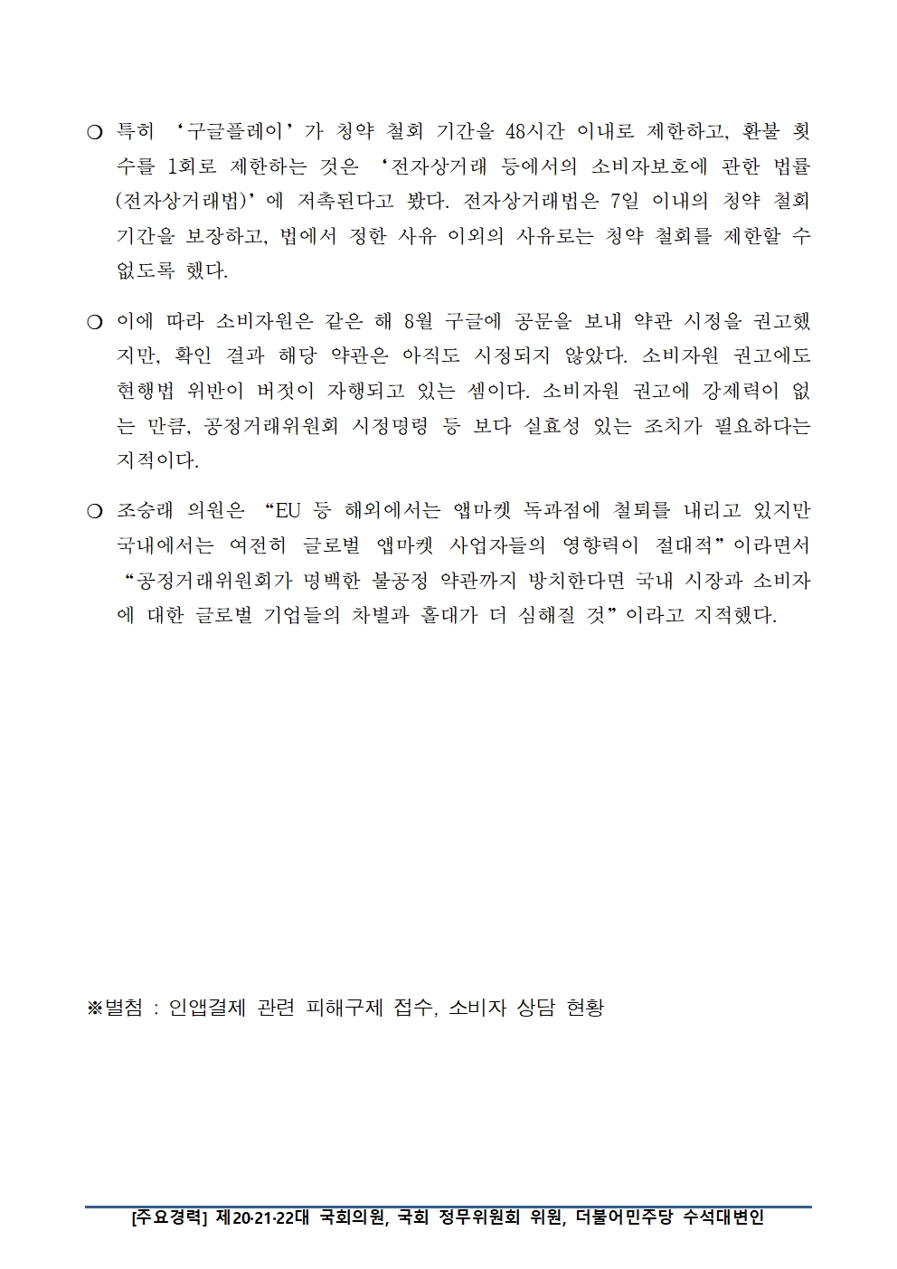[국회의원 조승래] 인앱결제 소비자 피해, 환불 문제 가장 많아…구글은 현행법 위반 약관 고수