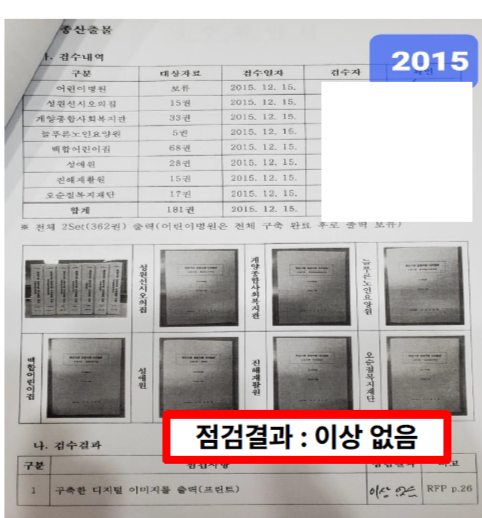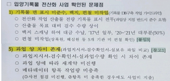 더불어민주당 김남희 의원실이 확보한 입양기록물 전산화 사업 감사 준비자료를 분석해 본 결과 2020년과 2021년의 경우 입양기록물 전산화 사업이 50% 백지로 스캐닝하였지만 대금을 지급했고, 과업 지침상 명시되어 있던 전산화 산출물 전량에 대해 기록물 표시를 하지 않았다. 이 외에도 편철 작업을 하지 않았으며, 산출물 목표 대비 검수 수량이 상이한 문제가 발생했다.