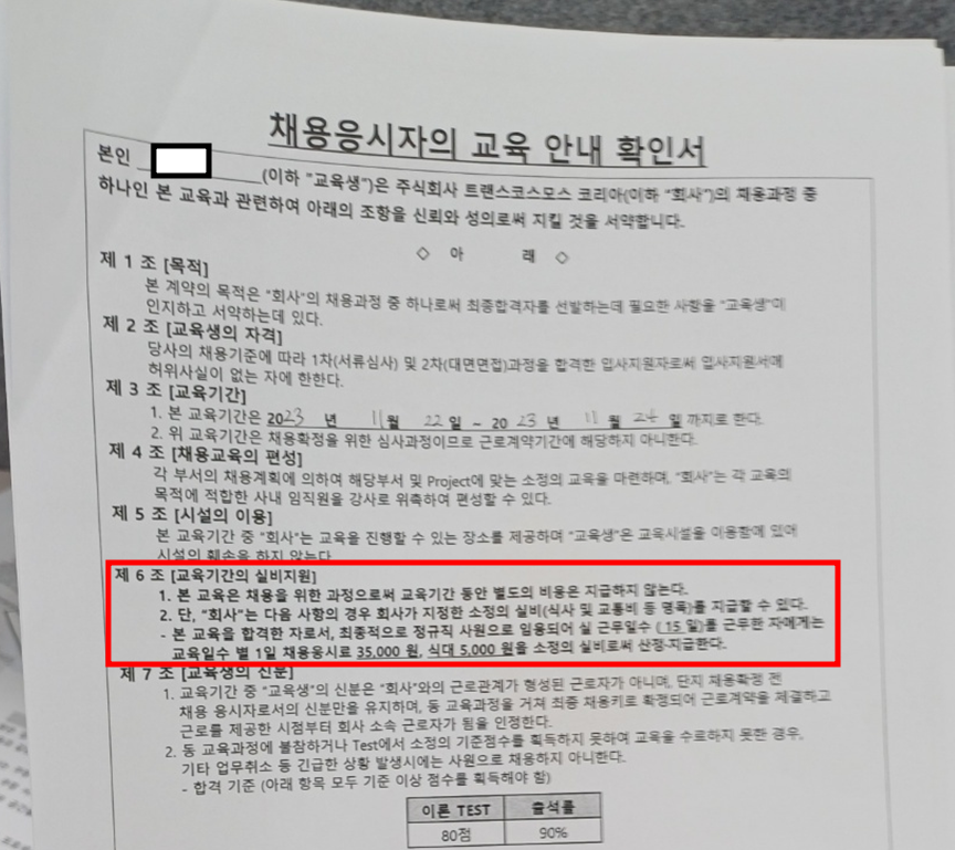 대표적인 콜센터 용역업체 ㈜트랜스코스모스코리아는 교육생들에게 ‘채용응시자의 교육 안내 확인서’를 받아 ‘실근무일수(영업일) 15일을 근무한 사람에게만 교육비 40,000원(식대 포함)를 지급한다’고 명시했다.