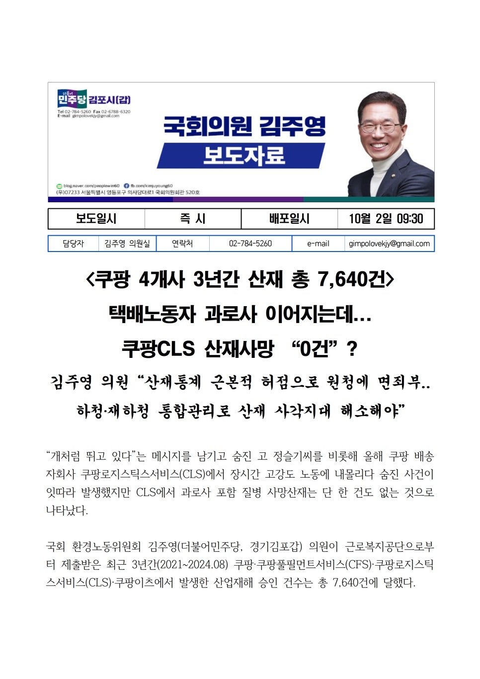 [국회의원 김주영] 쿠팡 4개사 3년간 산재 총 7,640건: 택배노동자 과로사 이어지는데...쿠팡CLS 산재사망 “0건”?