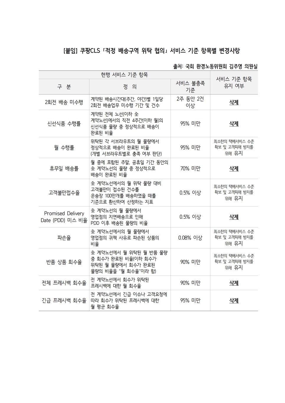 - [붙임] 쿠팡CLS 「적정 배송구역 위탁 협의」 서비스 기준 항목별 변경사항