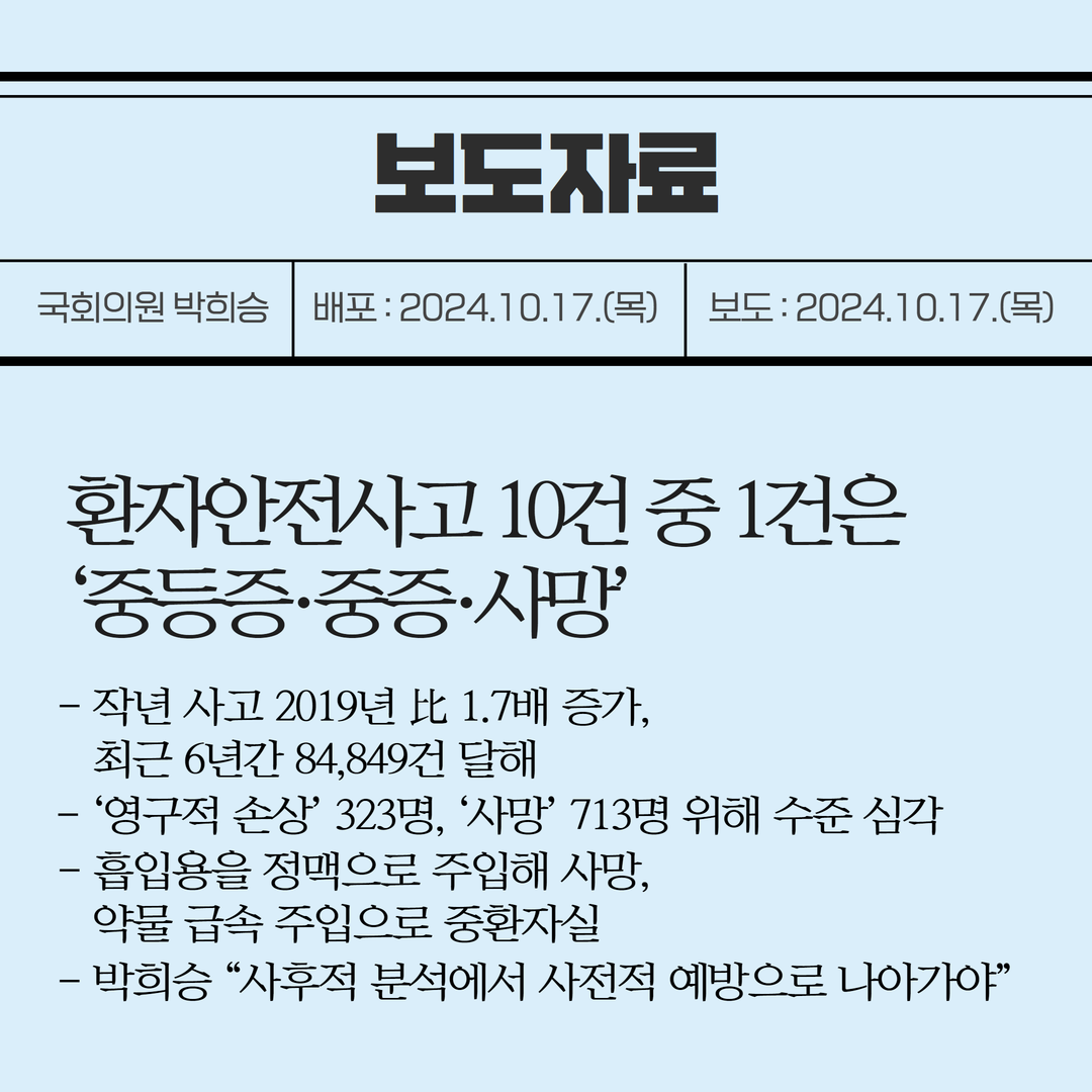 [국회의원 박희승 보도자료] 환자안전사고 10건 중 1건은 ‘중등증·중증·사망’