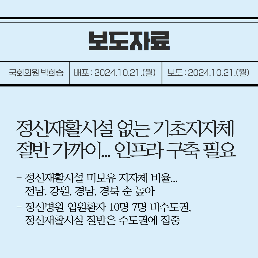 [국회의원 박희승 보도자료] 정신재활시설 없는 기초지자체 절반 가까이... 인프라 구축 필요