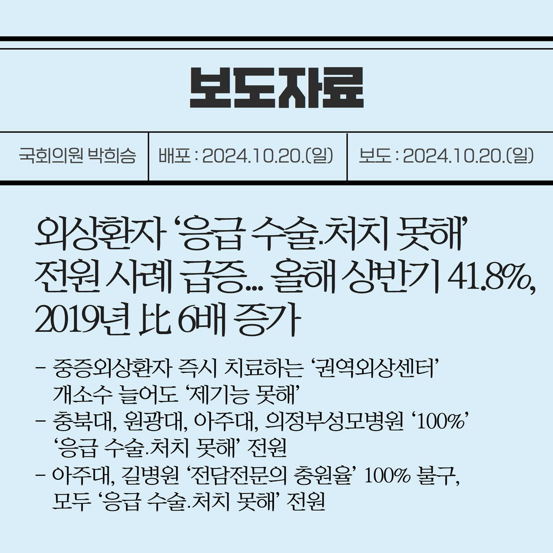 [국회의원 박희승 보도자료] 외상환자 ‘응급 수술․처치 못해’ 전원 사례 급증... 올해 상반기 41.8%, 2019년 比 6배 증가