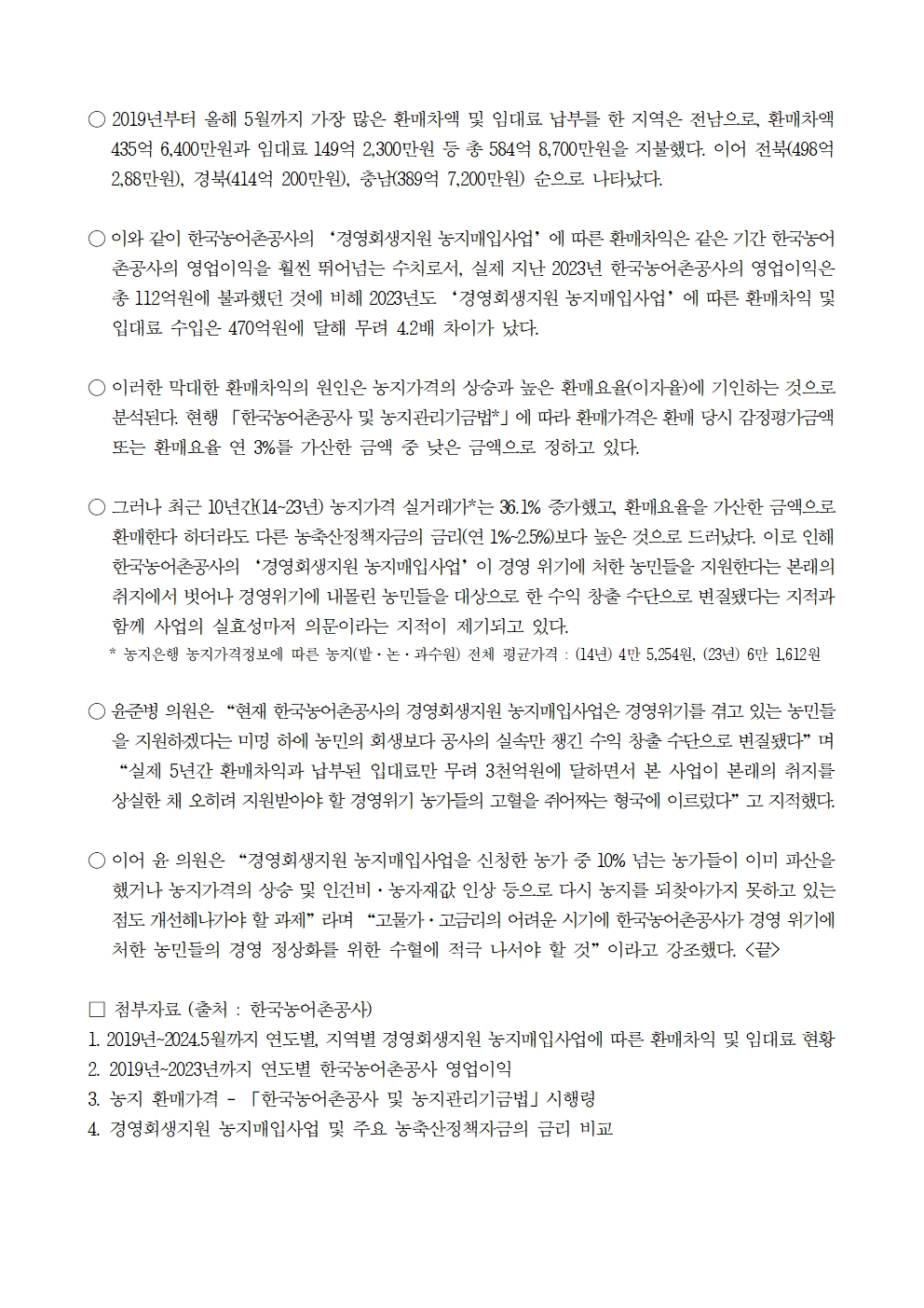 [윤준병 의원 국정감사 보도자료] 한국농어촌공사의 경영회생지원 농지매입사업_ 수익창출수단으로 변질