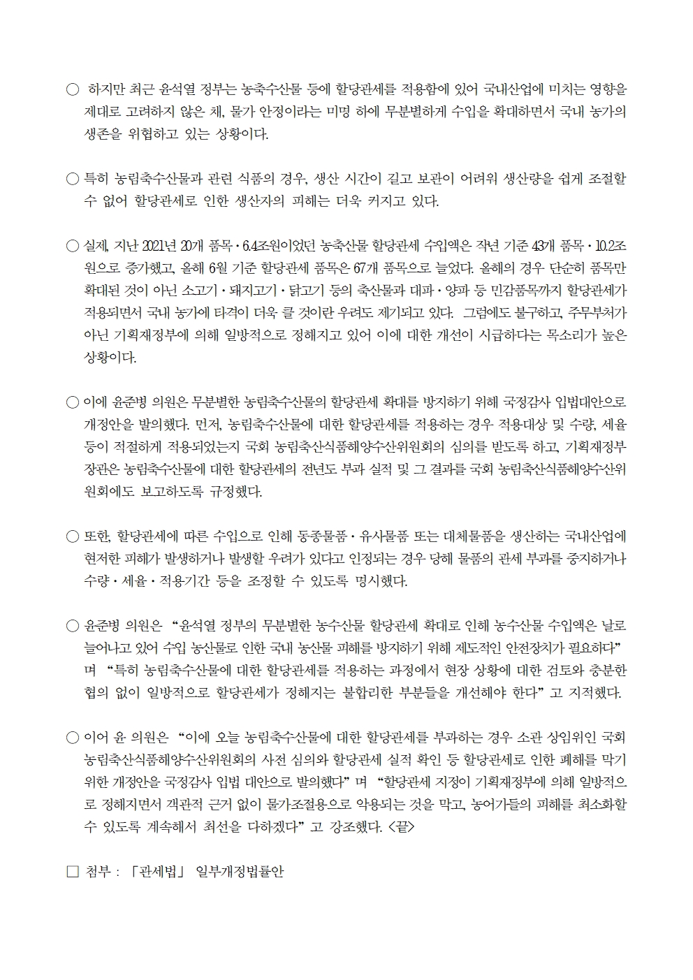 241023 [윤준병 의원 국정감사 보도자료] 국정감사 대안 ‘무분별한 농수산물 할당관세 확대 방지법’ 발의.hwp