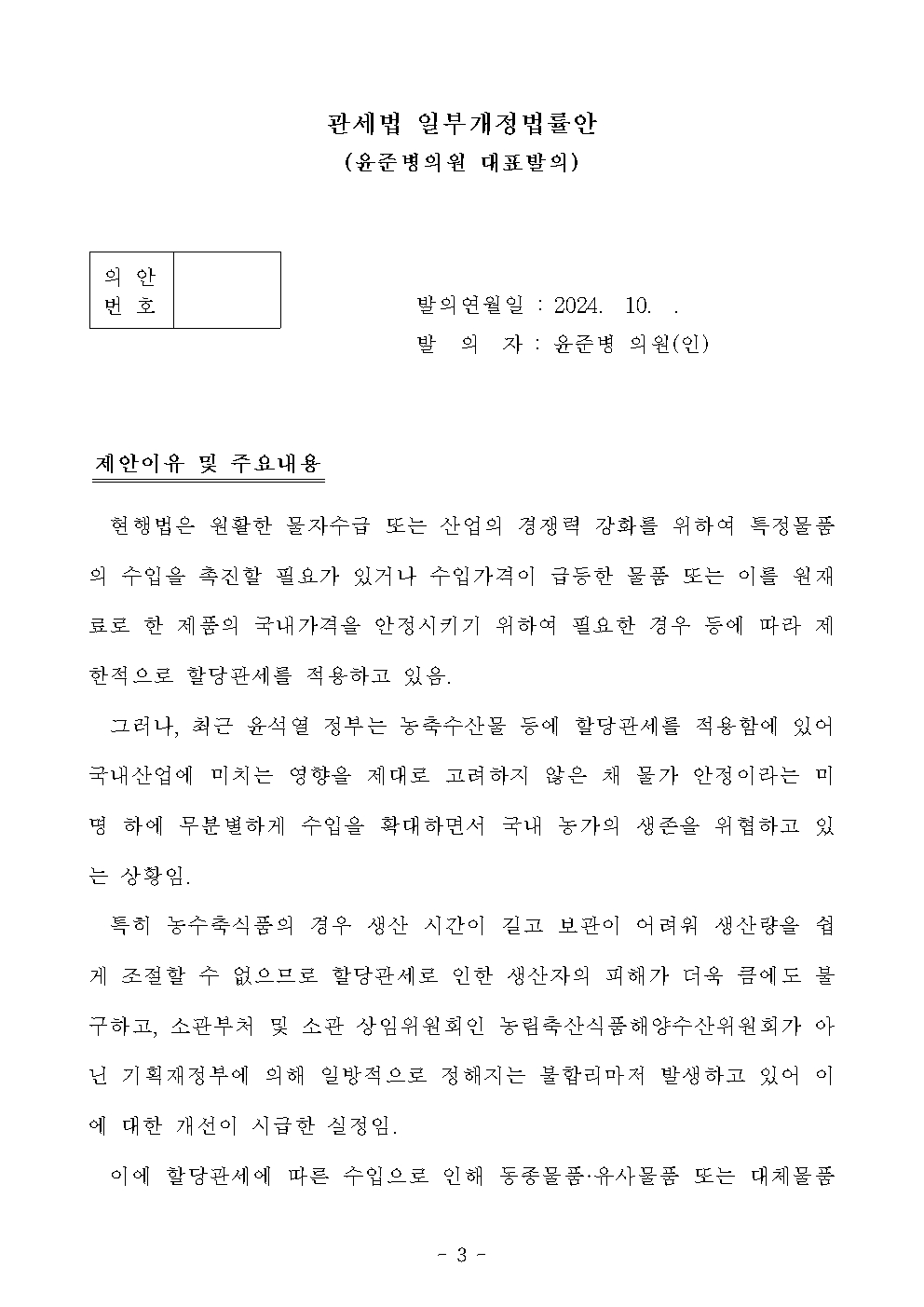 [윤준병 의원 국정감사 보도자료] 국정감사 대안 ‘무분별한 농수산물 할당관세 확대 방지법’ 발의