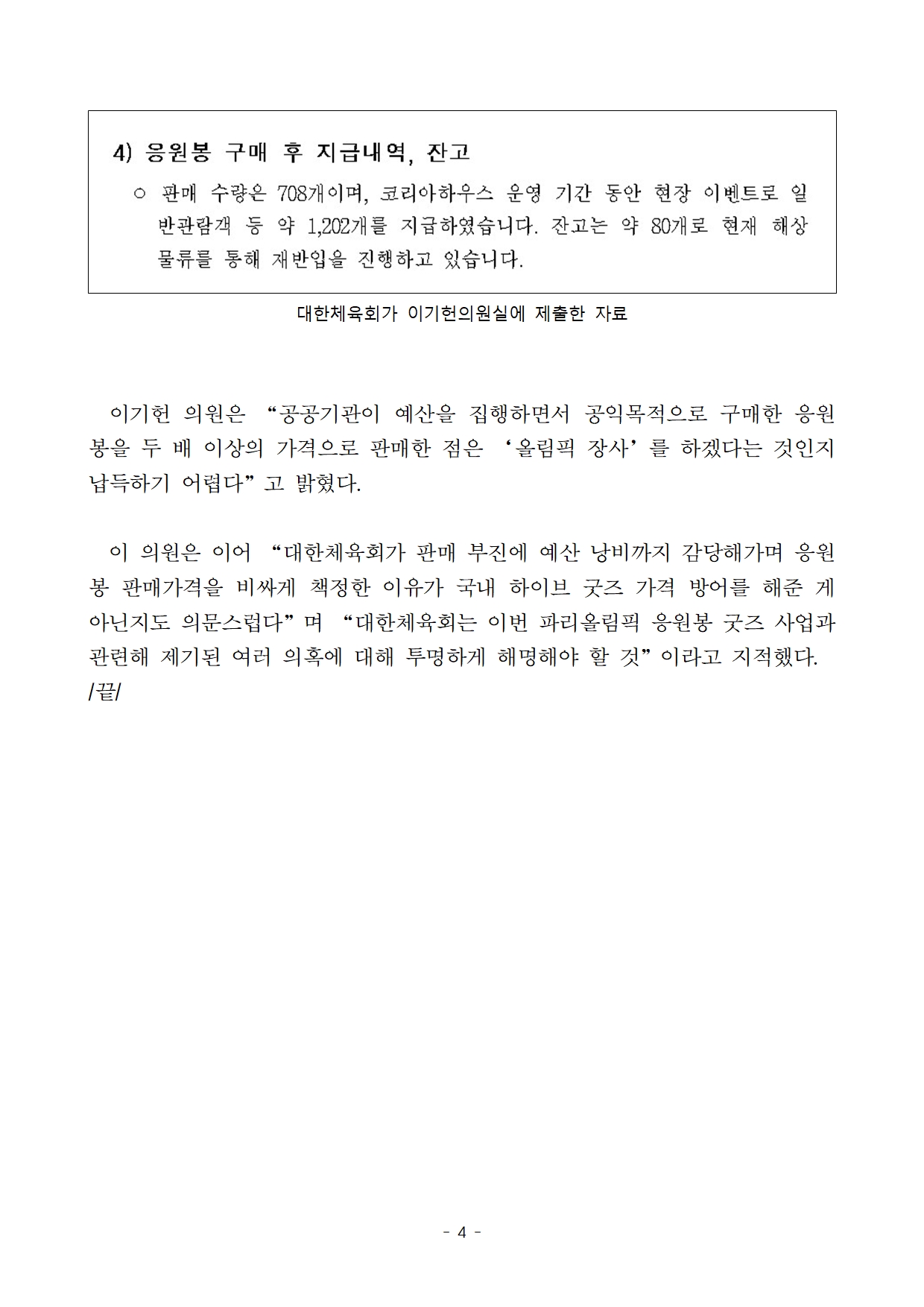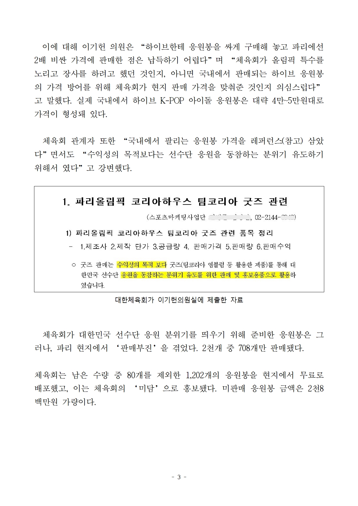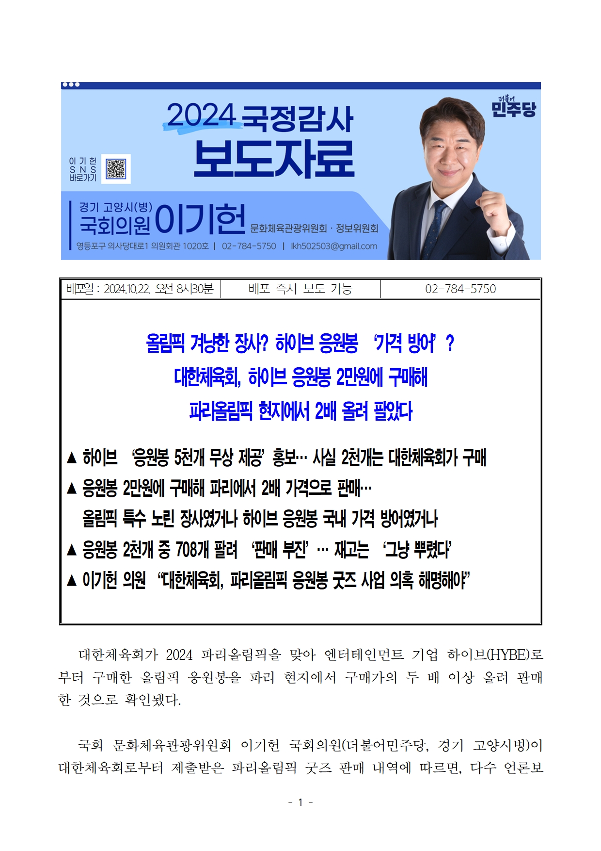 [이기헌 의원(고양시 병) 보도자료]올림픽 겨냥한 장사? 하이브 응원봉 ‘가격 방어’? 대한체육회, 하이브 응원봉 2만원에 구매해 파리올림픽 현지에서 2배 올려 팔았다