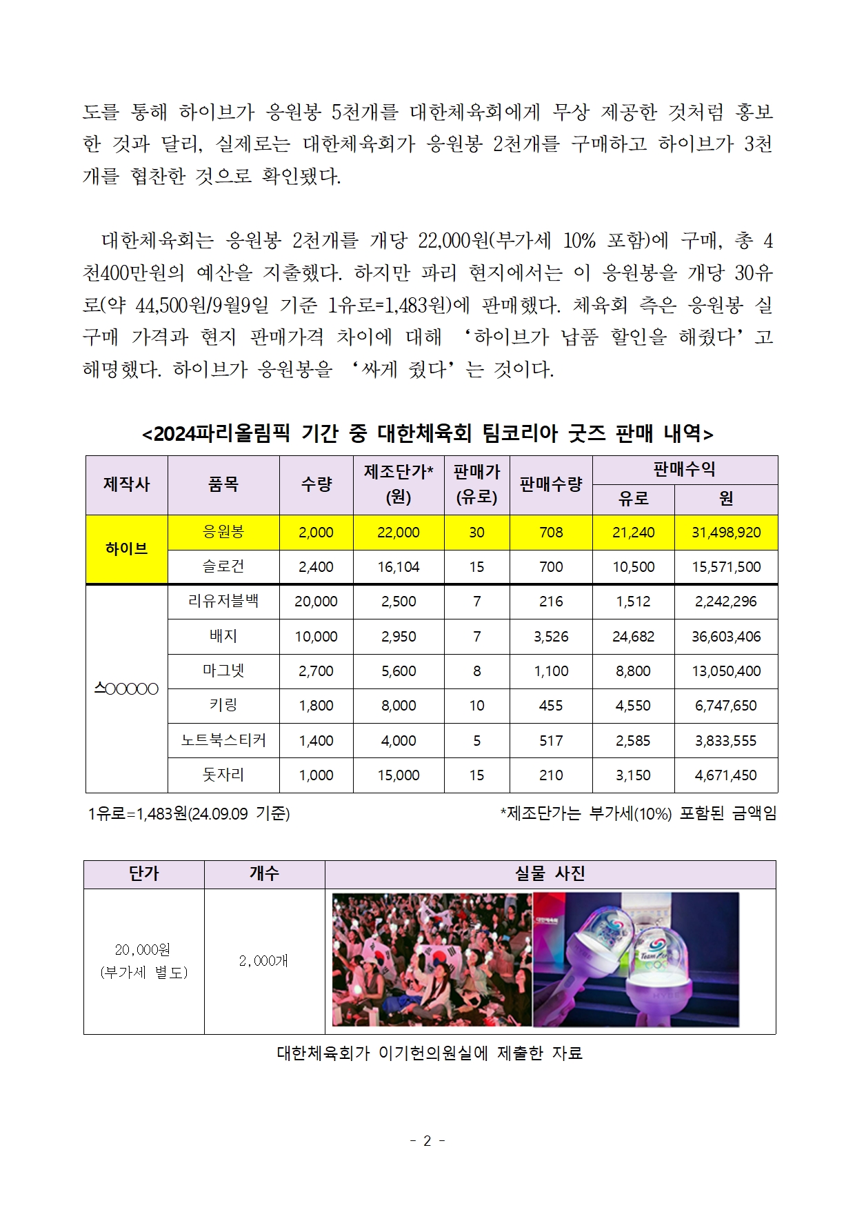 (1022)이기헌의원 국감_대한체육회 하이브 응원봉 2만원에 구매 파리에서 2배 올려 팔아.hwp